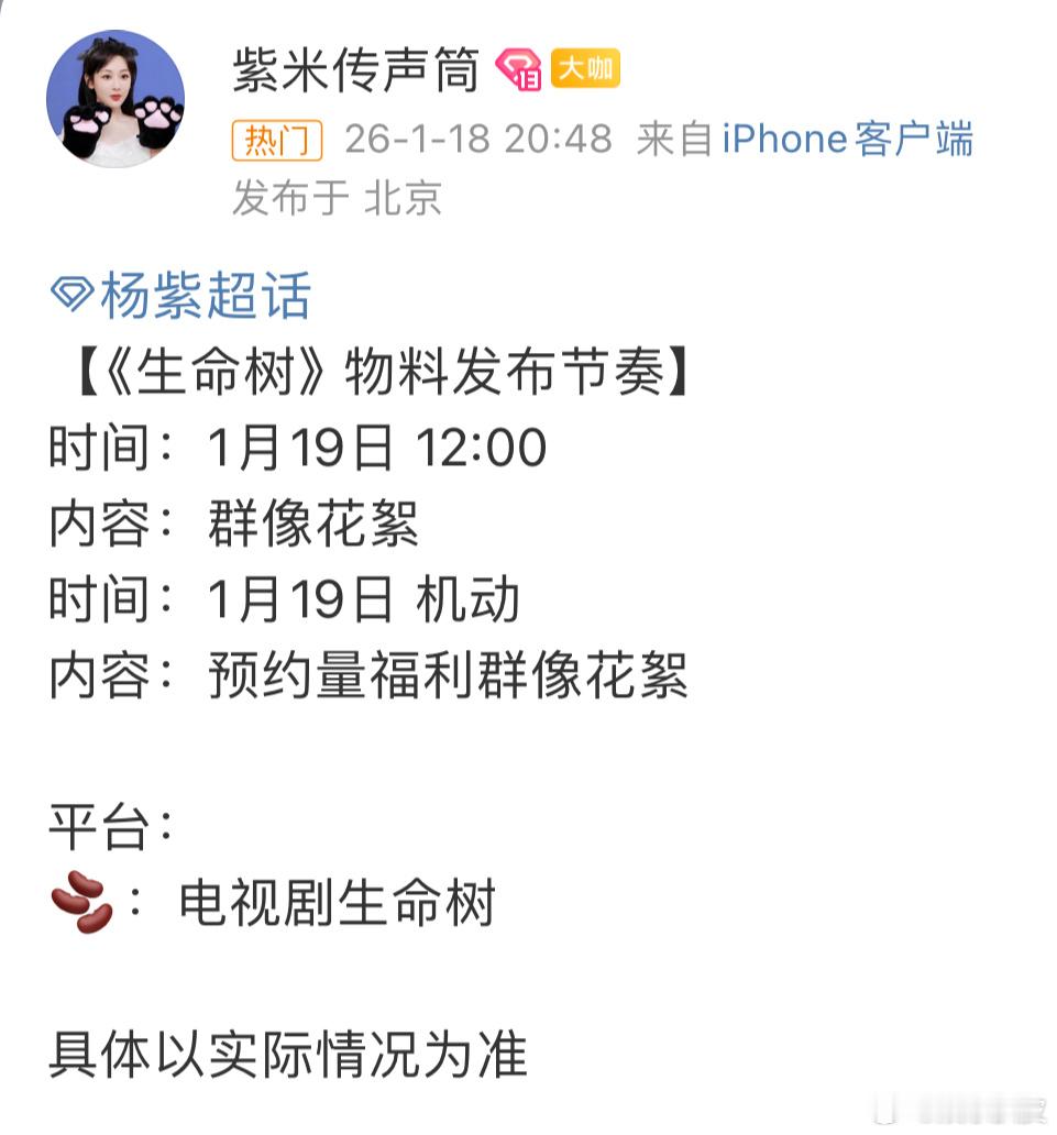 生命树发布节奏杨紫对接发布《生命树》的物料发布节奏,会有群像花絮,已经开始预热了,搬好板凳坐等定档2025微博之夜爆款创作大赛