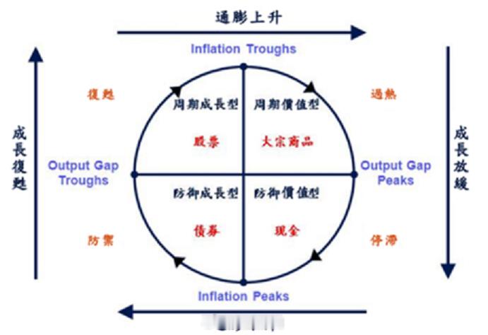 美林时钟是一个3-4年左右的经济周期,分为春夏秋冬四个季节。基于不同的季节配置不同的资产,有点类似于农业种地。春天种什么,夏天种什么是不同的。由于跨度是3-4年,所以四季的更迭是一个1年左右的时间跨度。也可能半年,也可能2年。比较是投资不是种地。基于美林时钟的阶段划分进行资产配置,是一个很常见的资产配置策略。