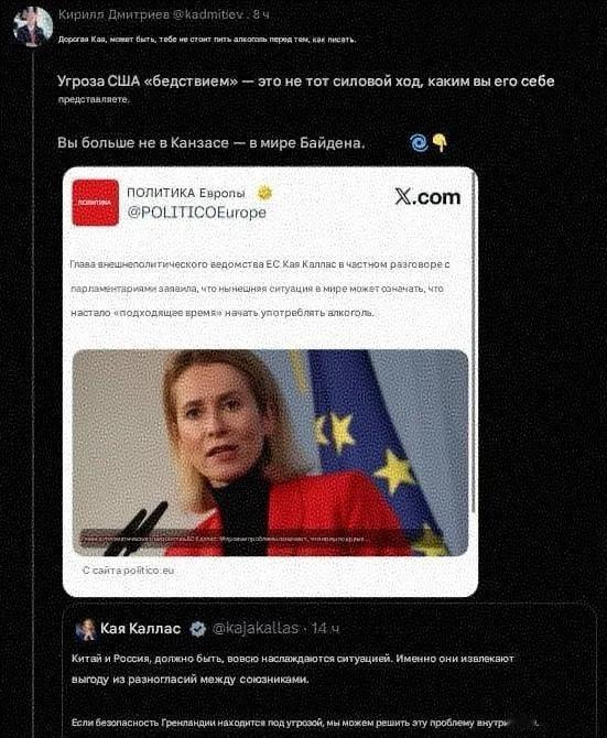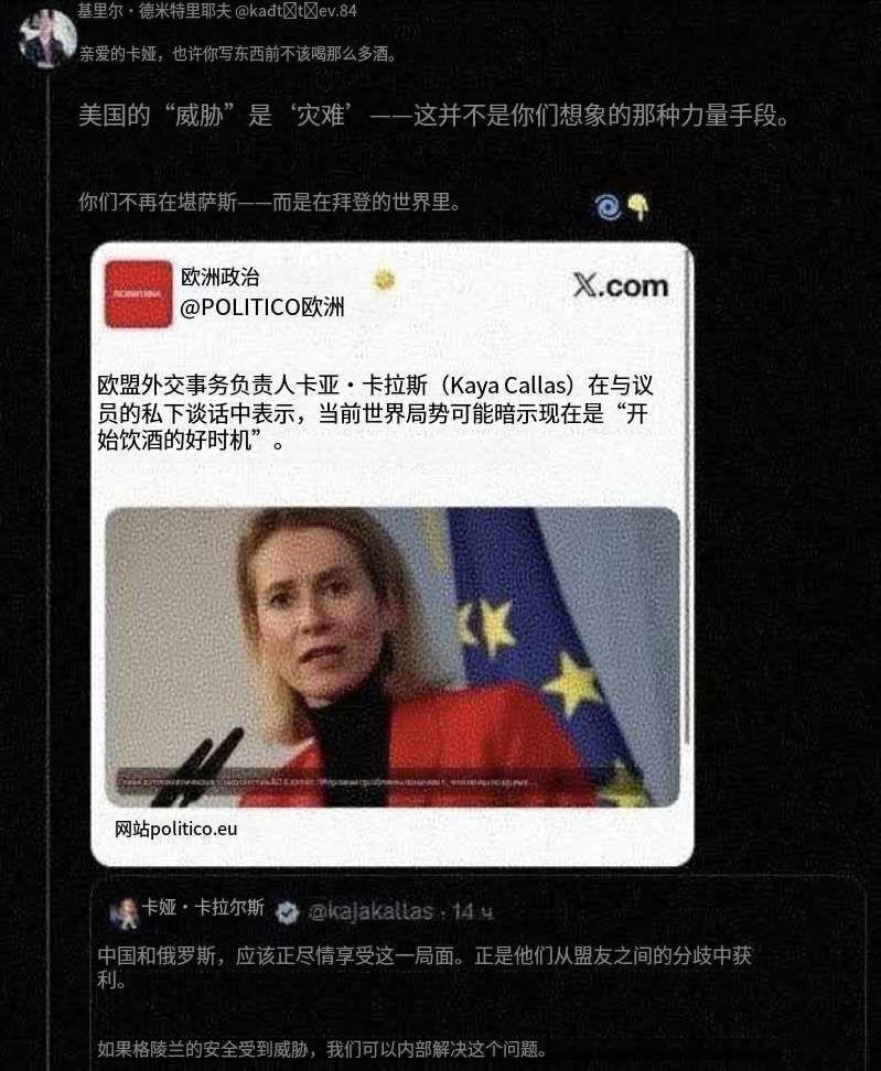卡拉斯遭到无情讽刺! 俄罗斯总统特别代表基里尔•德米特里耶夫在他的媒体@kadttev.84上对欧盟外交与安全事务高级代表卡娅·卡拉斯进行了无情的讽刺,她写到: 亲爱的卡娅,也许你写东西前不该喝那么多酒。 美国的"威胁"是"灾难"这并不是你们想象的那种力量手段。(因为)你们不再在堪萨斯而是在拜登的世界里。 让基里尔讽刺卡拉斯的是,她曾经在与议员的私下谈话中有句名言:当前世界局势可能暗示,现在正是"喝一杯的好时候"。 她还在网站上说:中国和俄罗斯,应该正尽情享受这一局面。正是他们从盟友之间的分歧中获利。 如果格陵兰的安全受到威胁,我们可以内部解决这个问题。 因为卡拉斯的无知、试图通过甩锅俄罗斯来说服特朗普不再觊觎格陵兰岛,因此基里尔还讽刺她说:你还活在拜登时期的世界里。