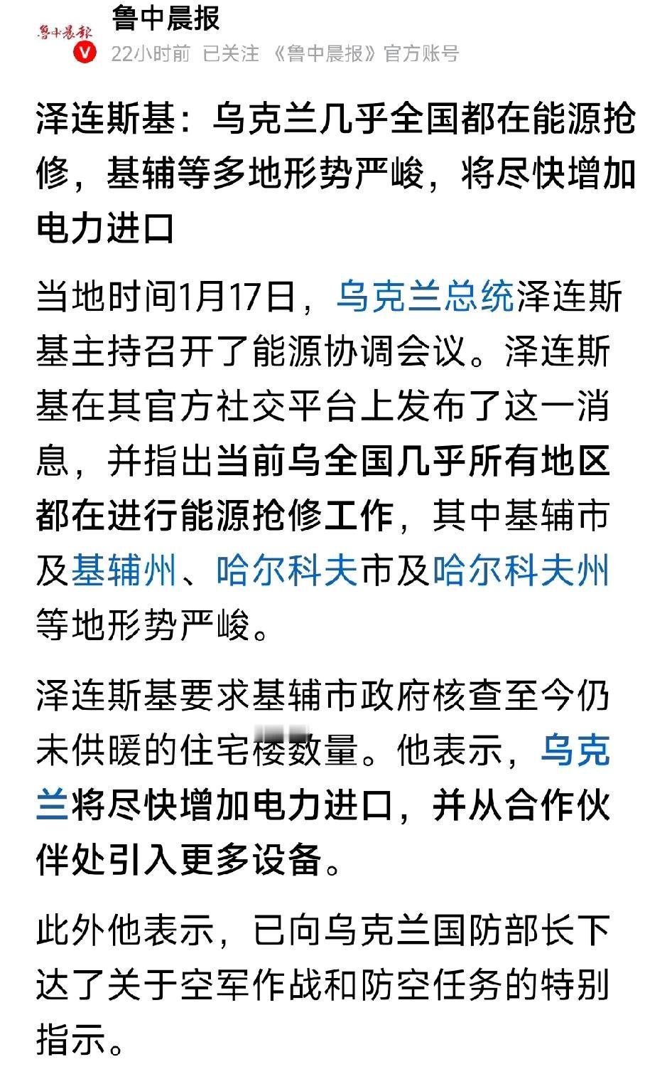 泽连斯基:乌克兰全国几乎都在抢修能源设施!乌克兰总统泽连斯基主持召开能源协调会议后在官方社交平台发布消息,称乌克兰几乎全国都在进行能源抢修,基辅市及基辅州、哈尔科夫市及哈尔科夫州等地形势尤为严峻 。 泽连斯基要求基辅市政府核查未供暖住宅楼数量,还表示将尽快增加电力进口,从合作伙伴处引入更多设备以应对能源危机 。同时,他已向乌克兰国防部长下达了关于空军作战和防空任务的特别指示 。 此前,俄罗斯军队于1月16日至17日夜间,在乌克兰多地发动袭击,攻击了包括敖德萨州和基辅州的变电站,引发紧急停电,这可能是导致乌克兰此次能源危机的重要原因。乌克兰问题 赖连斯基 泽伦斯基危机 泽连斯基腐败 泽连斯基遇袭 基辅断电 乌克兰危机