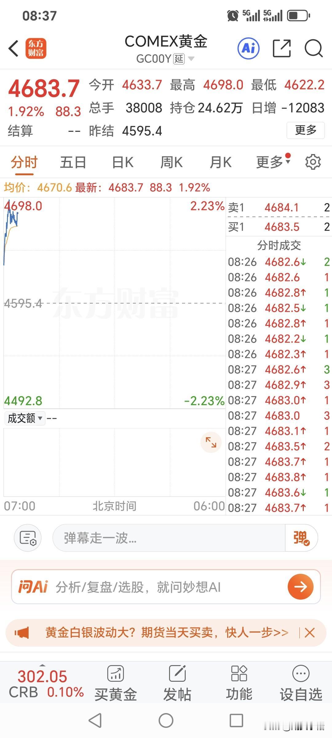 今日开盘伊始, 国际金价高开高走。 盘中最高升至4698美元, 现在报价4683.7美元, 较上一日上涨88.3美金。 看来今日国内黄金期货 高开已成定局。 期货小褚建议大家, 继续关注1050一线压力情况!