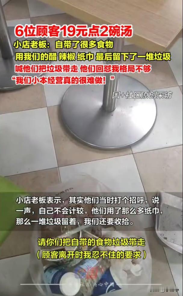 上海一家小餐馆里发生的事儿,最近在网上吵翻了天,6个人吃饭只花19块,最后还跟老板闹了矛盾,看完真是让人忍不住想说道说道。这天店里来了6位顾客,本来老板还挺热情地招呼,结果人家坐下后没怎么点店里的东西,就花19块钱点了两碗汤,其余吃的全是自己带来的。这也就算了,他们还把店里的免费资源用得明明白白,醋、辣椒一瓶接一瓶地倒,纸巾抽得满天飞,全用在了自己带的食物上,一点没客气。 几个人边吃边聊,足足占了一张桌子长达一个半小时,要知道小餐馆就那么几张桌,这时间里都没法招待其他客人了。等他们吃饱喝足准备走的时候,桌上的景象简直没法看,食物残渣、包装袋、用过的纸巾堆得乱七八糟,活脱脱留下了一堆垃圾。老板看着这狼藉的桌面,实在忍不住了,就上前跟他们说,能不能把自己带来的食物垃圾带走,毕竟店里收拾起来也得花不少功夫。 没想到这话一出口,其中一位男生立马不乐意了,直接回怼老板“你就这点格局”,说完一群人转身就走,留下老板站在原地一脸无奈。后来老板吐槽,其实要是他们提前打个招呼,说要自带食物,自己也不会计较这么多,毕竟做生意讲究和气生财。可关键是他们不仅消费少,还占用了大量资源,用完之后留下一堆烂摊子,连最基本的收拾都不愿意,这就让人有点难接受了。 要知道小本经营本来就不容易,房租、食材、人工哪样都要花钱,那些看似不起眼的醋、辣椒、纸巾,日积月累也是一笔不小的开销,更别说这么多人占着桌子影响翻台了。这事传到网上后,网友们都炸了锅,几乎一边倒地站老板,有人说“这哪是来吃饭的,分明是来薅羊毛还甩脸子的”,还有人吐槽“用着别人的东西,留下一堆垃圾,还好意思说别人没格局,真正没格局的是自己吧”。 大家最看不惯的还是顾客那句“没格局”的回怼,不少网友辣评“用最低的消费要求最高的服务,把别人的包容当理所当然,这才是真没格局”。其实餐饮消费本来就是双向尊重,顾客精打细算没问题,但不能把商家的善良当软肋,更不能突破文明就餐的底线。小餐馆本来就是城市里的烟火气,承载着老板养家糊口的希望,大家互相体谅一下,随手带走自己的垃圾,尊重别人的劳动成果,这不就是最基本的素养嘛,现在越来越多的人开始关注这件事,说到底也是因为大家都明白,小本经营的艰难值得被看见,文明就餐的底线更不能丢。