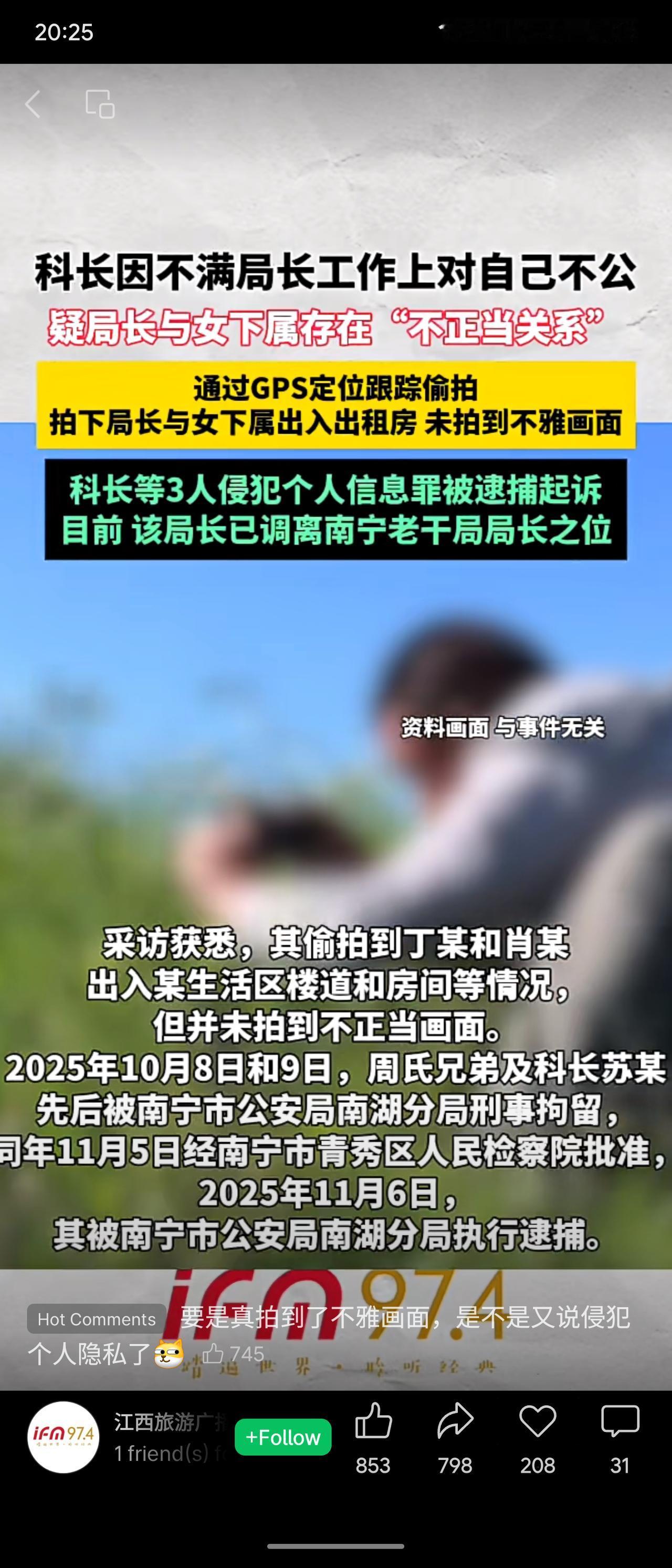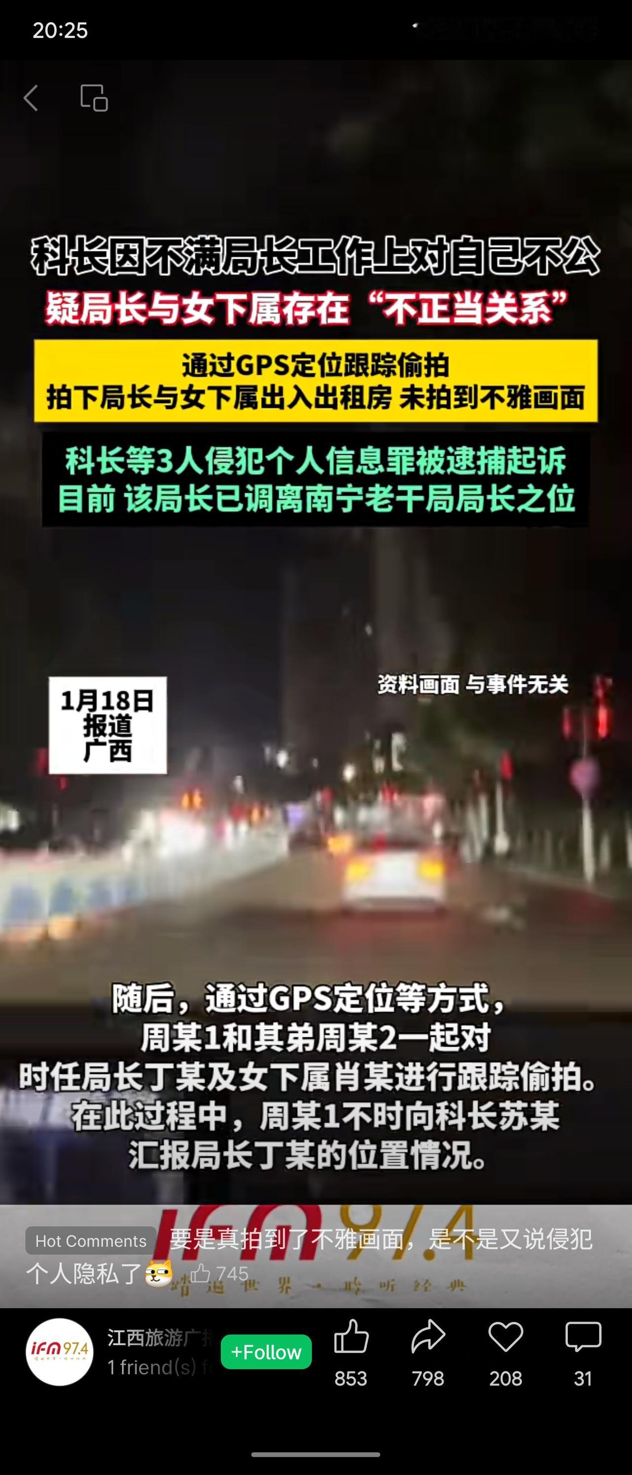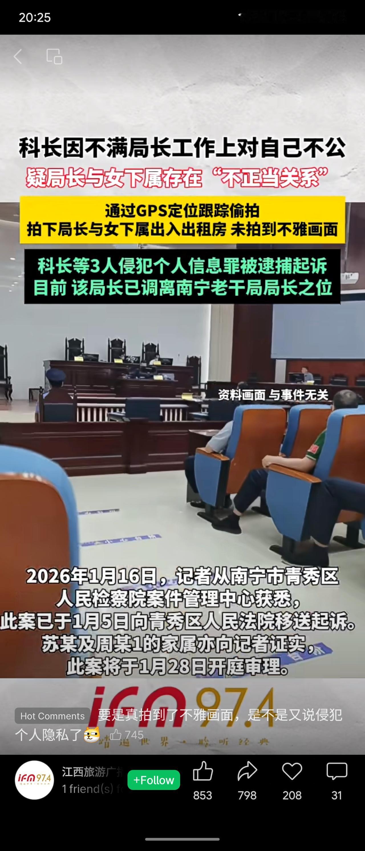 南宁一科长因不满局长工作不公,怀疑其与女下属有不正当关系,遂伙同他人通过GPS定位、跟踪等方式偷拍局长,但未获不雅画面证据。目前,该科长等三人因涉嫌侵犯个人信息罪被逮捕并移送起诉,案件将于近期开庭审理。涉事局长已被调离原职。