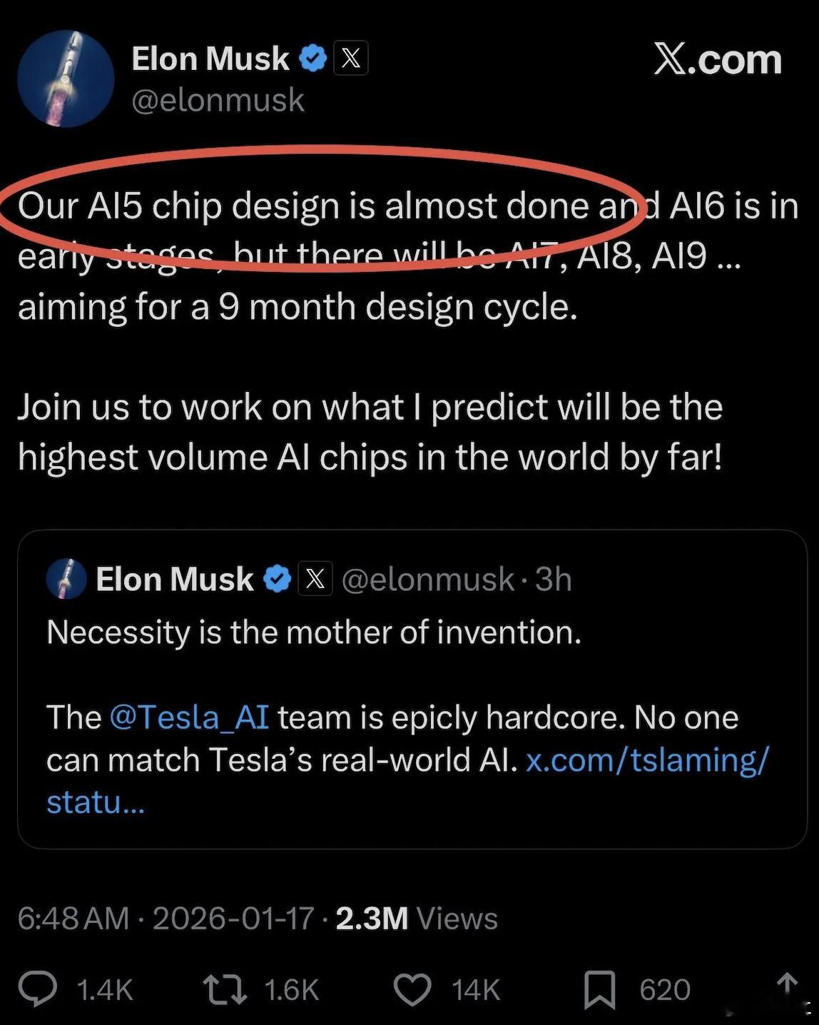 马斯克:AI5芯片设计接近完成马斯克今天早上在推特上发布了一则招聘启事,透露了一则重磅消息:“我们的 AI5 芯片设计已接近完成,AI6 处于早期阶段,但未来还将推出 AI7、AI8、AI9……目标是 9 个月的设计周期。加入我们,共同研发我预测将是迄今为止全球产量最高的AI芯片!马斯克此前曾大力宣传AI5的性能将比目前的AI4强10倍,而AI4本身相比HW3已经有了显著提升。据报道,特斯拉正与三星和台积电合作生产这些芯片,可能采用4纳米甚至3纳米工艺。当然马斯克声明中最令人惊讶的或许是他提出的AI6、AI7及未来芯片“9个月设计周期”的目标。在半导体行业,9个月的周期完成一次重大架构升级几乎不可能,即使是像苹果这样的巨头,设计周期也是以年为单位。