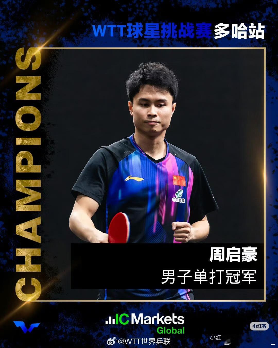 乒乓球运动员周启豪生于1997年,中国国籍,广东省乒乓球队男队运动员。周启豪是中国乒乓球队主力运动员。2021年10月周启豪获得乒超联赛男团冠军。2017年3月4日,在杜塞尔多夫世锦赛队内选拔赛中,周启豪以2比1战胜马龙。11月22日,在乒超联赛八一大商客场迎战安徽朗坤,周启豪以3比1战胜樊振东。2018年11月3日,在瑞典公开赛男单四分之一决赛中,周启豪以4比1战胜德国名将奥恰洛夫。2020年10月4日,乒乓球全国锦标赛男团决赛,周启豪所在的广东队以3-2逆转战胜北京队,夺得冠军。2022年6月国际乒联第25周排名,男双林高远/周启豪排名第10。2023年8月国际乒联公布第35周的男单世界排名,周启豪排名第20。周启豪生于1997年,中国国籍,广东省乒乓球队男队运动员、中国乒乓球队主力运动员。2023年1月15日-21日,参加WTT常规挑战赛多哈站。1月18日男单1/16决赛,周启豪3-0战胜贝内迪克特·杜达。1月24日男单1/16决赛中,周启豪3-1战胜若奥·蒙泰罗。1月25日男单1/8决赛,周启豪3-0战胜布莱恩·阿凡纳多尔,在男单1/4决赛,周启豪0-3负于周恺。2月14日,入选WTT球星挑战赛果阿站2023中国队名单。2月18日-23日,参加德班世乒赛选拔赛。3月2日,WTT球星挑战赛果阿站,世界排名第40位的周启豪以1比3不敌林昀儒。4月6日,入选WTT曼谷站中国队单打参赛名单。4月23日-29日,参加2023WTT球星挑战赛曼谷站。6月19日,2023年WTT常规挑战赛拉各斯站男单决赛,周启豪4-1战胜奥恰洛夫,赢得男单冠军。2026年多哈明星挑战赛的冠军得主!