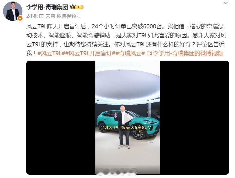 风云T9L开启盲订后,24小时订单突破6000台!从配置上来看,2920mm轴距的大五座,CLTC工况下230km纯电续航,亏电油耗也只有3.9L/100km,再加上智能豪华座舱和猎鹰700辅助驾驶。配置确实很有竞争力,就看最后定价会去到哪里,而且现在盲订有挺多权益享受,还可以自由退款。大家是因为什么而盲订风云T9L呢奇瑞风云T9L风云t9l开启盲订