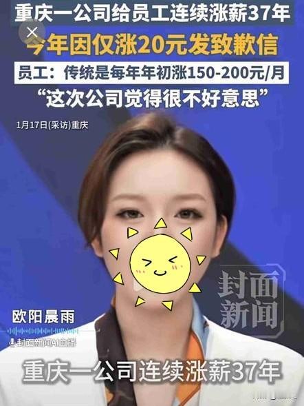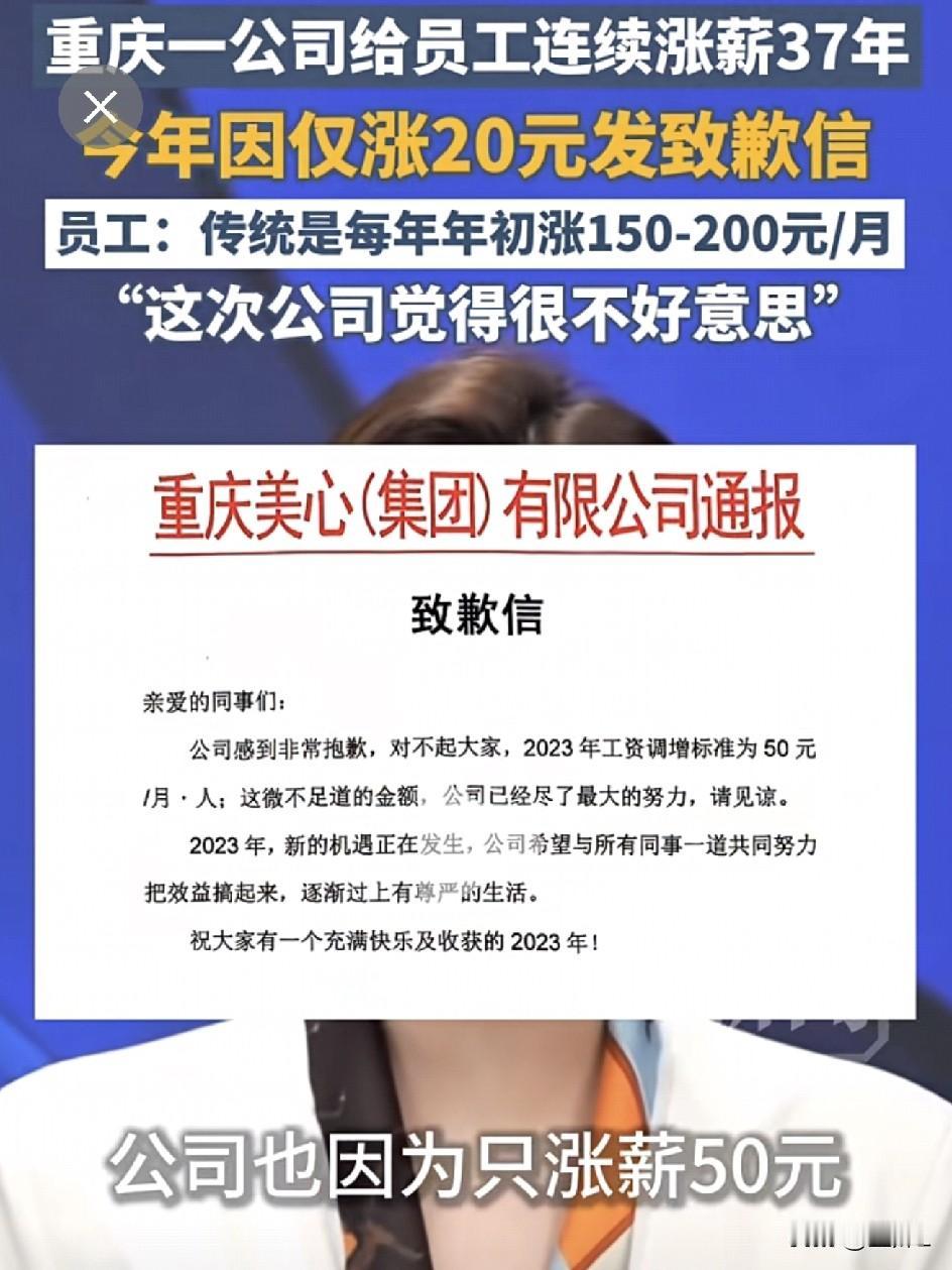 “对不起,今年只能涨薪20块!”重庆一公司连续37年坚持涨薪,今年含泪致歉!网友:这是什么神仙公司?我慕了! 当别的公司都在裁员减薪时,重庆有家企业的操作,把人整破防了。 他们今年给基层员工涨工资——每月20元,还贴出一封致歉信,开头就是:“非常抱歉,对不起大家。” 为啥要道歉? 信里写得很实在:制造业回款难,其他业务也没达标,这点钱是公司“在困境中的最大心意”。 没想到,这一“微薄的心意”,竟是这家公司连续第37年坚持“年初必涨薪”的初心! 老员工透露:往年一般涨150-200元,最近几年确实不容易。 2023年涨50元时也道过歉,2025年压力那么大,最后还是决定:“哪怕只加20元,也要传递信心——公司还在,承诺还在。” 这家叫美心集团的企业,做防盗门起家。集团的中层也曾担心“涨太少员工会觉着没面子”。 但高层认为坦诚比面子重要——“效益好不好,都得跟员工交个底”。 网友看完心情复杂: “20元确实不多,但连续37年不中断,比很多‘画饼公司’强太多。” ‘今年加20,希望明年能加200!’ “原来真有公司把‘年年涨薪’写进基因里……” 这大概就是“企业界的良心彩蛋”: 效益好时一起笑,效益差时不裁员、不减薪,哪怕只加一顿早饭钱,也要告诉你——咱们的约定,我没忘。 在连续几年到处都是裁员降薪的大环境下,有个稳定的工作已经是幸运了,而这家集团还能坚持给基层员工涨薪,绝对属于神仙企业了! 在寒冷的日子里,一点微光也是暖的。 你的公司今年涨薪了吗?评论区聊一聊! 素材来源:封面新闻,侵联删! 带定位晒今日生活 我的今日状态:💰期待暴富 我这里的天气:❄️下雪