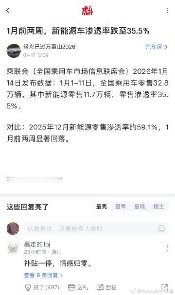一月新能源渗透率暴跌?是跟补贴有关,还是跟燃油车年前消费意愿有关【来自懂车帝车友