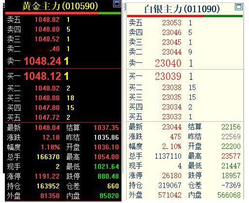 又到了过年商品市场的 中场休息一刻时间, 随着国际黄金和白银的变动, 日内恢复交易以后, 国内黄金和白银期货主力合约, 经历冲高减弱的过程, 不过纷纷止跌回升。 截止10:15分, 国内黄金期货主力合约 停收于1048.04元, 较上一日上涨12.18元。 白银期货主力合约, 停收于23044元, 较上一日上涨475元。 对于贵金属, 期货小褚认为关注上方压力情况!