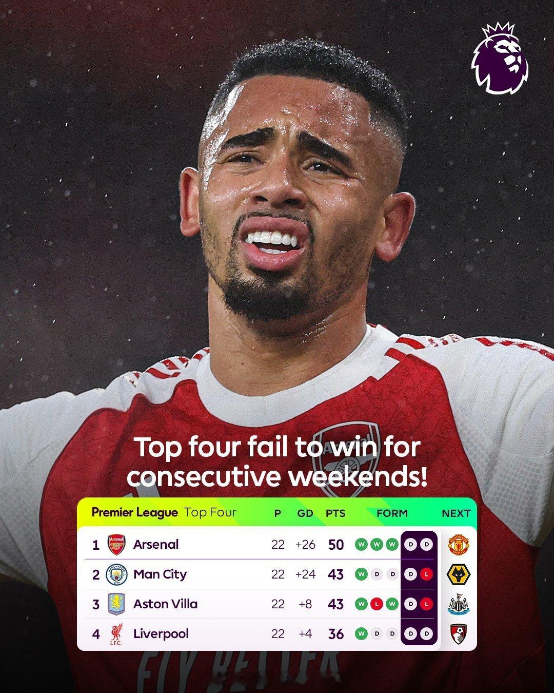 【英超重回让四时代?】目前英超排名前四位的球队,阿森纳、曼城、维拉和利物浦,最近两轮联赛都没有赢球,这让后面的球队(曼联、切尔西、纽卡斯尔)重新看到争四(争五)的希望?英超联赛PS:“让四”这个词,是不是有两三年没有提过了?