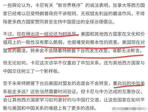 联合早报认为,对于中加关系的转暖,中国似乎也不应该“太乐观”了!1月19日,联合早报刊文表示,卡尼有关“新世界秩序”的说法表明,加拿大等西方国家已经难以忍受特朗普政府不讲规则、无视盟友利益的霸道作风,这显示不排除更多的西方国家赞同甚至支持中国提出的全球治理倡议。   卡尼这句引发加拿大省长吃惊的表态,确实戳中了当前西方阵营的内部矛盾。   美加之间的盟友纽带近年出现了明显裂痕,美国发动的全球关税大战没有给加拿大特殊待遇,让高度依赖美国市场的加拿大经济承受重压,而特朗普曾扬言吞并加拿大的言论,更让这个主权国家感受到前所未有的羞辱。   这些经历让加拿大彻底意识到,过度绑定单一国家的外交策略存在巨大风险,这才有了卡尼政府转向中国的务实选择。   此次卡尼访华成果确实亮眼,这是加拿大总理时隔8年再次访华,两国不仅发表了联合声明,还签署了8项具体合作文件,涵盖经贸、能源等多个领域。   加方明确要取消对中国电动汽车的高额关税,中方也调整了针对加拿大油菜籽的反倾销措施,双方甚至签署了经贸合作路线图,建立起部长级的对话机制。   卡尼本人也公开表示,愿同中方构建强劲可持续的新型战略伙伴关系,还高度评价中国的全球治理倡议,承诺要密切多边协调。   但联合早报的提醒绝非多余,这些积极变化背后藏着不少值得警惕的变量。美加之间的深层绑定不是短期能瓦解的,两国不仅有北美防空司令部这样的防务联合机制,产业链更是高度一体化,这种长期形成的依存关系不会因为几次政策调整就断裂。   加拿大萨斯喀彻温省省长听到“新世界秩序”时的吃惊反应,恰恰说明加拿大国内还有大量停留在旧盟友思维里的势力,这些势力随时可能对卡尼的对华政策形成掣肘。   更关键的是,加拿大当前的对华转向,核心驱动力是对美国霸权的不满,而非对中国发展理念的完全认同。   全球治理倡议虽然获得了联合国秘书长古特雷斯的肯定,也得到了马来西亚、巴西等国的支持,但这些支持多来自发展中国家或新兴经济体。   加拿大这类西方国家的态度,更多是将中国倡议视为制衡美国的工具,而非真心想推动建立更公正的全球治理体系。一旦美国调整对盟友的策略,减少利益压榨,加拿大的外交重心完全可能出现摇摆。   中加关系的基础也还不够牢固。前些年双边关系因加方不理性行为陷入紧张的教训仍在眼前,如今的转暖刚刚起步,互信需要长期培育。   两国在政治制度、发展道路上的差异客观存在,未来难免会遇到新的分歧。虽然双方建立了对话机制,但机制的有效性需要时间检验,一旦出现突发状况,能否真正发挥缓冲作用还是未知数。   加方取消电动车关税、重启经济对话等举措,本质上是基于现实利益的计算。   中国作为加拿大第二大贸易伙伴,能为其农产品、能源产品提供广阔市场,超过半数的加拿大人都支持加强对华经贸合作,这种民意基础是合作的重要推力,但利益驱动的合作往往带有不确定性。   如果未来中国市场出现变化,或者美国以更优厚的条件拉拢加拿大,其政策连续性就会面临考验。   所以说,中加关系的转暖值得肯定,这为动荡的世界注入了正能量,也为两国人民带来了实际利益。但保持审慎乐观才是理性选择,不能因为短期成果就忽视长期风险。   中国既要珍惜当前的合作势头,积极落实各项共识,也要看清西方国家外交中的利益优先逻辑,做好应对各种变数的准备。毕竟,真正稳固的双边关系,需要超越对第三方的不满,建立在彼此真正的尊重与持久的利益契合之上。   官方信源及发布时间:《中国和加拿大领导人会晤联合声明》,人民日报,2026年1月16日16时18分;