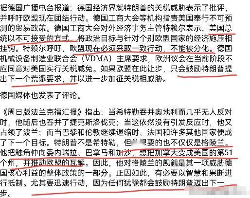 德国内部这一次对美国空前强硬,但德国总理默茨对美国则有点软!1月19日,面对特朗普的野心,德国在野党绿党认为,现在绝不能在特朗普面前退让。总理默茨退让和安抚的策略已经失败。在捍卫国际秩序时,需要的是自信和清晰立场。而德国经济界表示,美国总统以不可接受的方式,将政治目标与针对个别欧盟国家的经济施压相挂钩。 德国工商大会对外贸易主管沃尔克·特雷尔的话其实代表了整个行业的情绪,他直接点出美国这种把政治目标和经济施压绑在一起的做法根本没法接受。 这种不满不是空穴来风。特朗普17号刚在社交平台上放话,2月1号起就要对德国在内的八个欧洲国家加征10%关税,到6月还要飙到25%,理由居然是要逼丹麦卖格陵兰岛。 这操作让德国工业界彻底炸了,机械设备制造业联合会主席卡夫拉特直接骂这要求“荒谬”,还警告要是欧盟敢让步,只会让美国得寸进尺提更过分的要求。 德国经济现在本就难扛这种冲击。伊弗经济研究所测算过,美国关税可能让德国今年GDP直接降0.3%,而德国经济已经连着两年衰退,汽车、机械这些出口支柱产业早就扛不住了。下萨克森州的工会负责人周日就公开担忧,工业本来就增速放缓,再加关税怕是要把复苏的希望全浇灭。 紧接着站出来的是在野党绿党。他们19号直接把矛头对准默茨,说总理那套退让安抚的路子已经彻底失灵,面对特朗普的野心必须硬气起来。 绿党的表态其实戳中了不少德国人的心思——毕竟特朗普这波操作连美国自己的专家都看不下去,基尔世界经济研究所就说了,加征的关税最后还是美国消费者买单,等于自己砸自己的脚。 但默茨的态度确实透着犹豫。他最近跟特朗普通电话时,还在强调美国是德国“不可或缺的伙伴”,这跟经济界、绿党的强硬形成了鲜明对比。 有人骂他软,但其实这背后藏着德国的老难题。默茨当了十年“大西洋桥”主席,一直是出了名的亲美派,就算上台后喊着“对美独立”,也没法一下子切断几十年的依赖。 更关键的是德国的经济软肋。德国经济研究所早就预警过,特朗普的关税政策可能给德国带来三重打击:出口跌、工业垮、岗位没。 汽车行业首当其冲,美国市场占德国汽车出口的大块份额,25%的额外关税一落地,德国汽车工业协会主席希尔德加德·穆勒算过账,不光车企利润受挤压,美国消费者买车成本也得涨,最后全是输家。 默茨的妥协还有安全层面的考量。他虽然在推欧洲战略自主,想跟英法建“欧洲核威慑力量”,但这事儿远水救不了近火。 现在北约框架下的安全保护还得靠美国,东欧国家又一门心思亲美防俄,默茨不敢真把关系闹僵。加上他上台时承诺要带德国经济走出低谷,要是跟美国彻底翻脸,每年2000亿欧元的损失扛不住,竞选承诺就成了空话。 可绿党和经济界不吃这一套。德国金属工业工会官员托尔斯滕·格罗格就说,这种贸易政策根本没有赢家,大西洋两岸的消费者和企业全得遭殃。 绿党更直接,他们认为捍卫国际秩序就得有清晰立场,默茨那种既想搞欧洲自主又想保跨大西洋关系的平衡术,本质上是自欺欺人。 其实德国副总理兼经济部长罗伯特·哈贝克早在上个月就放话,德国已经备好反制措施,不会在关税压力下无底线屈服。 这说明政府内部也不是铁板一块,默茨的“软”更像是一种无奈的平衡。毕竟他要面对的不只是美国的压力,还有国内保守选民对稳定的需求,以及联盟党内部的亲美势力。 这波分歧说到底是德国外交老矛盾的爆发:既要摆脱对美依赖,又不敢真的撕破脸。绿党靠着强硬表态争取民意,经济界为了自家生意据理力争,默茨则夹在中间玩平衡。 但特朗普的关税大棒已经挥过来了,10%的关税还有半个月就生效,默茨要是再拿不出让各方满意的办法,这内部的裂痕只会越来越大。 信源:德国之声(DW)发布时间:2025年1月19日