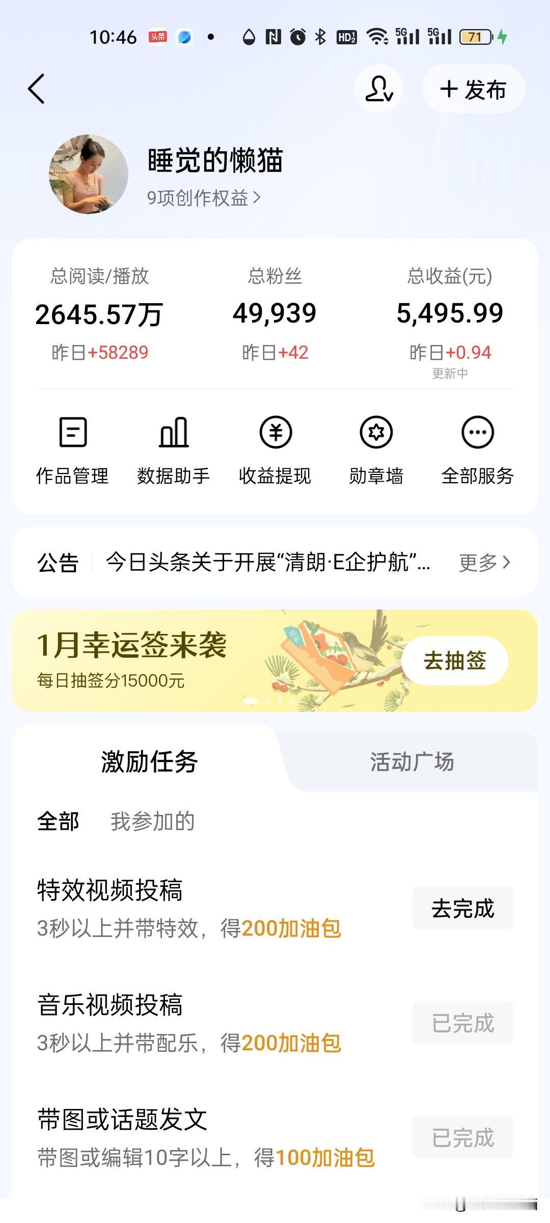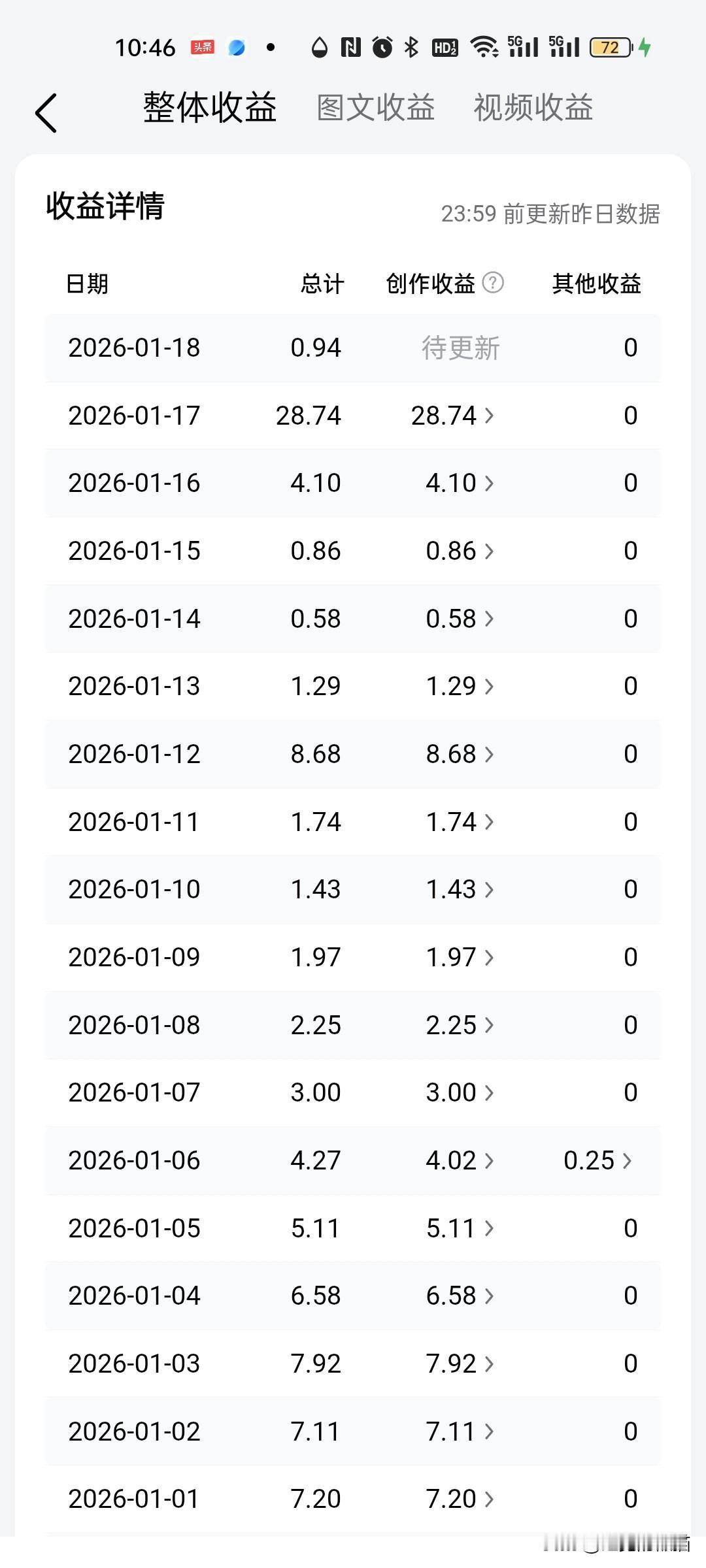 不要轻信那些玩头条能够月入上万的,就连大V都不一定能够月入上万吧,头条每天的收益都非常不稳定,我来头条也有几年了,你们可以看看我的收益,绝对没有造假,都是真实的,如果有人跟你说帮你月入上万,别怀疑,就是来割你韭菜的,以前我也听那些所谓的大神说过什么类目要垂直,文章要原创之类的,结果是没有展现,没有阅读量,辛辛苦苦写了大篇文章,收益就几毛,有的才几分钱,所以我现在都不相信这些什么要垂直之类的,自己随便戏几个微头条一天至少都有几毛钱,所以头条上没有黄金,只有那碎银几两