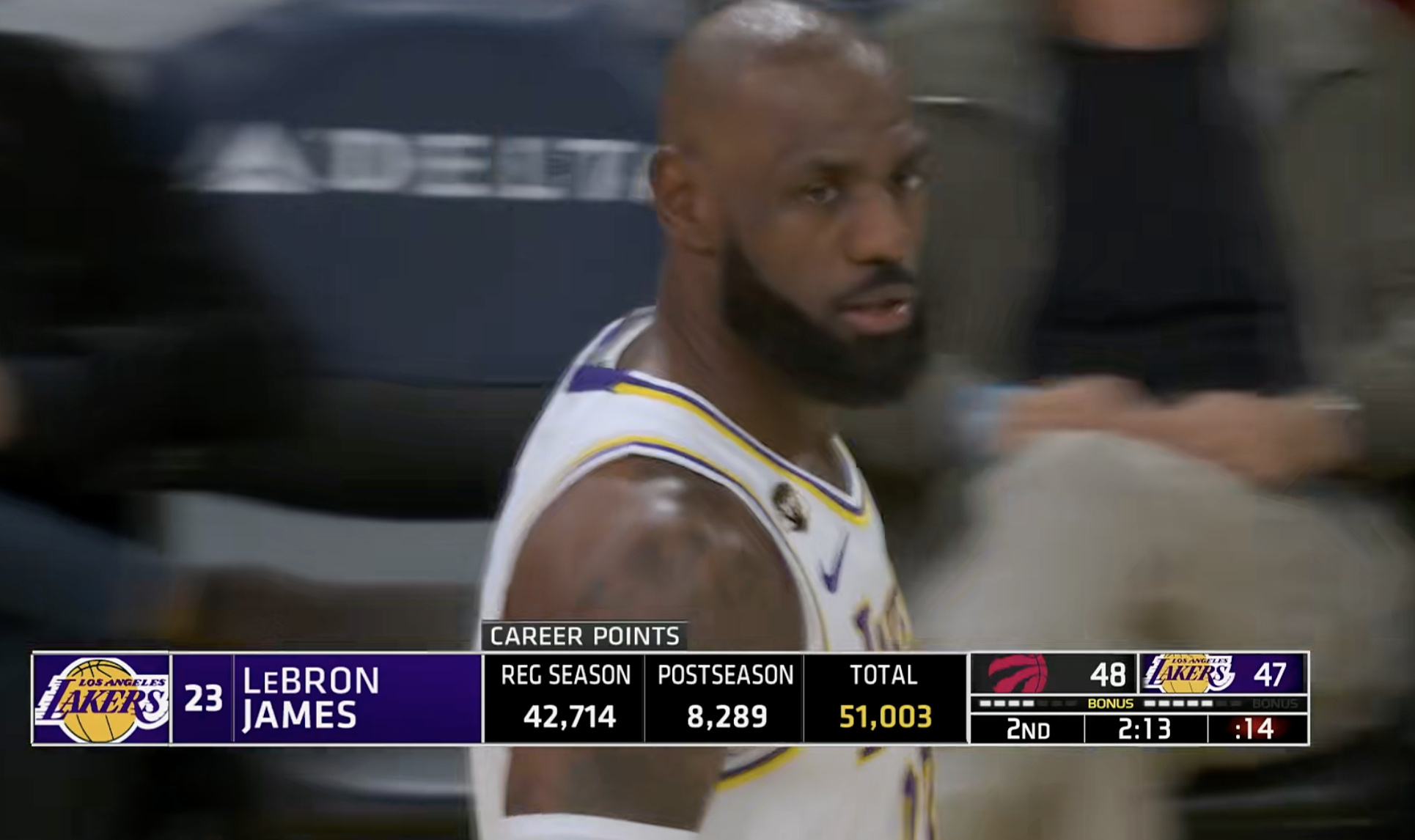 恭喜詹姆斯,生涯总得分超过51000分!👑🐐常规赛42714分季后赛8289分 猛龙vs湖人洛杉矶湖人