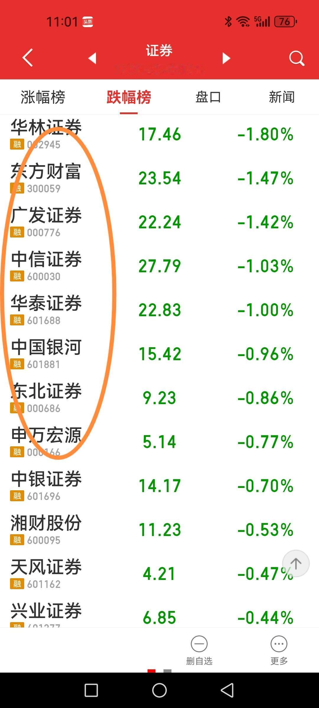 猛砸头部券商大票为哪般? 周一早盘,指数一波快速上涨到10点10分变开始回落,分时图上明显发现是权重股回落明显,分明是权重股遭到打压。 从券商板块跌幅榜可见,跌幅前列的都是大票,东方财富、广发证券、中信证券、华泰证券、中国银河、申万宏源跌幅都在1.4%~0.8%。 可上证指数还上涨十几个点,为什么使劲压着券商板块不松手呢?不可能行业有啥大利空吧,业绩增加是明摆着的事,所以连外资都看不懂大A的逻辑,更不要说散户了,如何让人树立价值投资的理念?