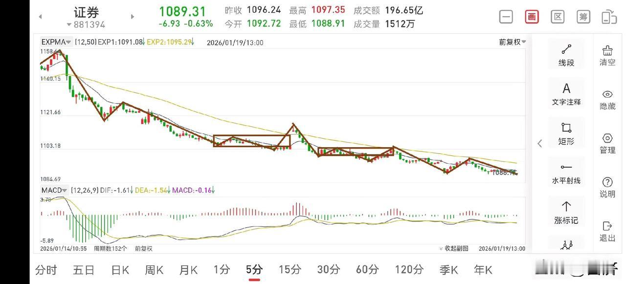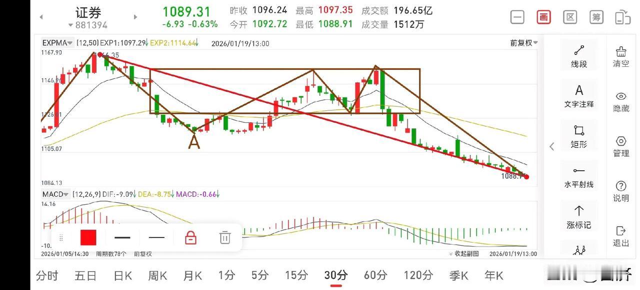 聊聊证券板块(2026.1.19) 今天证券板块还是延续了上周的下跌,但这里跌幅明显收窄,反弹行情就在这二天,所以还需耐心等待,不急不躁,安心持股待涨。 1.从30分钟图一上看,macd绿柱已明显缩小,空头力量已接近衰竭,整个日线一笔回踩已接近尾声,而且这笔日线回踩形成的是日线二买,所以机会就在眼前,操作上耐心持股待涨就是了。 2.从5分钟图二上看,上午再次形成了5分钟的三买,这里是否会再次构建第三个5分钟下跌中枢不得而知,但即便如此,那也是最后的极限收尾,所以此处是机会远大于风险的,无忧。 3.商业航天板块真正有业绩支撑的走势无忧,目前妖龙走势正常,屡创新高,即将冒头,超越中国卫星的涨幅指日可待。证券板块动态 股票收盘之后,如何复盘分析