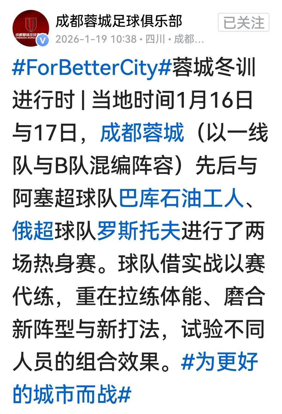 皇帝不急太监急,成都蓉城稳得起! 蓉城在西亚热身赛惨败,惹部分蓉迷着急。对此,蓉城官方出来解密:与阿超、俄超球队的热身,出场的一线队与B队混编阵容,重在拉练体能、磨合打法、尝试组合,并非以赢球为目的。 看来,蓉城很信任阿诺伊西,用老带新的混编队战欧洲球队,管理层对输赢根本无所谓,你个粉丝们着啥子急?[捂脸]