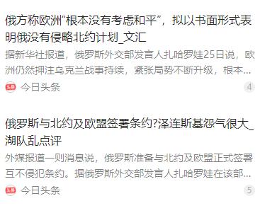 俄罗斯终于让步了!俄罗斯突然甩出一个让全世界都挺意外的重磅提案。俄罗斯外交部发言人扎哈罗娃公开表示,愿意与北约、欧盟签署具有法律效力的“互不侵犯条约”,甚至提出要把这一承诺写入宪法。这个消息一出来,全球政坛直接炸了锅。谁能想到,和北约硬刚了几十年的俄罗斯,会主动递出这样的橄榄枝,而且还愿意用宪法来背书。 麻烦看官老爷们右上角点击一下“关注”,既方便您进行讨论和分享,又能给您带来不一样的参与感,感谢您的支持!   2025 年 12 月 26 日,俄罗斯外交部发言人扎哈罗娃在莫斯科的新闻发布会上,抛出了一个让全球都始料未及的提议:俄罗斯愿意与北约、欧盟签署具有法律约束力的 “互不侵犯条约”,甚至可以将这一承诺写入宪法。   这个消息一出,全球政坛瞬间沸腾。要知道,俄罗斯和北约硬刚了几十年,从冷战时期的剑拔弩张到近年的地缘博弈,双方一直处于紧张对峙状态,如今俄方主动递出橄榄枝,还用宪法背书,着实超出了所有人的预期。   扎哈罗娃的表态并非随口说说,俄罗斯副外长里亚布科夫随后补充,俄方愿意将 “不进攻” 条款提升至宪法高度,这种做法在现代外交中几乎前所未有。草案明确写明,双方互不主动发动攻击,互不进行军事挑衅,所有约定都白纸黑字,具备充分的法律效力。   俄方此举背后有着深层的安全考量。自北约东扩以来,已经完成了五轮扩张,2023 年芬兰加入后,俄罗斯与北约的陆地边界增加了近 1300 公里,加里宁格勒飞地被三面包围。每周,北约侦察机平均三次抵近俄罗斯边境,有时距离仅几十公里。   俄罗斯西部工业区直接暴露在导弹射程内,这种持续的安全压力让莫斯科不得不寻求破局。表面上看这是和平姿态,实则是高明的地缘政治博弈,既想分化西方阵营,又能占据舆论高地,核心诉求则是换取北约停止东扩。   毕竟几百年来,俄罗斯的安全观一直基于缓冲地带,没有足够的战略空间,就始终缺乏安全感。上世纪 90 年代北约东扩时,俄罗斯的抗议没能阻止局势发展,如今用条约形式明确承诺,相当于把难题抛给了西方。   面对这一提案,北约的反应相当直接。秘书长吕特在布鲁塞尔紧急开会后明确表示反对,认为乌克兰战事尚未结束,这种保证缺乏信任基础。但北约并没有放缓针对俄方的动作,反而加快了东欧东翼地区的防御建设。   北约计划到 2035 年将成员国国防支出提高到 GDP 的 5%,2025 年的军事演习次数比 2024 年增加了 20%。在波罗的海港口,士兵检查船只的时间从两小时延长到半天,物流延误成了常态,军事对峙的态势丝毫没有松动。   有北约内部外交官私下透露,没有俄罗斯这个对手,北约的存在意义就会大打折扣,威胁感正是这个军事联盟的凝聚力所在。这种心态让北约很难真正接受俄方的和平提议,更多将其视为一种战略博弈手段。   欧盟的处境则更为尴尬,内部态度严重分化。一方面,德国、匈牙利等国态度温和,德国民众多次举着 “钱要修学校,不是买导弹” 的标语上街抗议,2024 年德国甚至没完成 GDP2% 的军费目标。   另一方面,立陶宛、拉脱维亚等波罗的海国家反应强烈,2025 年还推动北约在爱沙尼亚启动 “刺猬 2025” 军演,参与兵力超过两万。欧盟需要兼顾地区和平诉求与乌克兰等东欧成员国的安全诉求,陷入了两难境地,多次开会都没能得出统一对策。   作为冲突的核心方之一,乌克兰政府的态度相当强硬。泽连斯基政府坚持加入北约的立场,强调国家主权和安全不受外部力量左右,而加入北约已被写入乌克兰宪法,贸然更改会面临巨大国内舆论压力。   乌克兰还提出,和谈的前提是俄罗斯归还所有被控制领土、赔偿战争损失并追究 “战争罪行”,对于顿巴斯撤军等要求明确拒绝。这种强硬立场让俄欧之间的条约落实,面临着难以逾越的现实障碍。   值得一提的是,扎哈罗娃在声明中特意强调:“对局势升级负责的是倾向于施压的西方国家。” 这句话通过媒体传遍全球,让俄罗斯成功塑造了愿意对话的形象,而这也迎合了国际社会的普遍诉求。   2025 年联合国大会上,超过 50 个国家呼吁俄乌冲突停火,各国早已对战争感到疲惫。俄罗斯的提案正好契合了这股和平呼声,也让西方陷入了两难 —— 拒绝就显得不愿和平,接受则会让北约东扩失去理由。   中国外交部门对俄罗斯的提案明确表示支持,强调通过和平谈判与法律约束解决争端、维护地区安全稳定符合各方利益,为复杂的局势提供了理性视角。   目前,俄罗斯与美国就乌克兰冲突的谈判正在 “缓慢但稳定” 地推进,但扎哈罗娃也指出,谈判进展受到了某些西欧国家的破坏,俄方一直在呼吁美方共同抵制这种行为。