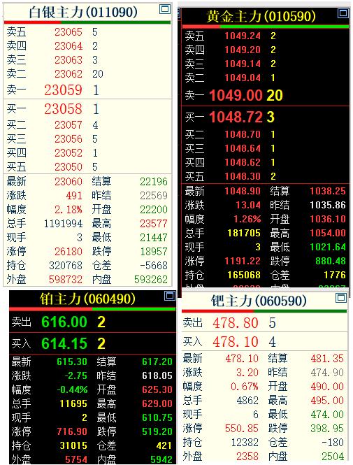 上午国内贵金属偏强运行, 多个合约走强上涨, 盘中再创新高, 不过随后有所减弱。 截止11:30分, 国内黄金期货主力合约 停收于1048.9元; 白银主力合约 停收于23060元。 广期所的铂金和钯金, 有所分化。 铂金主力停收于615.3元, 钯金主力停收于478.1元。 面对再度飙升的贵金属, 期货小褚建议大家观望为主!