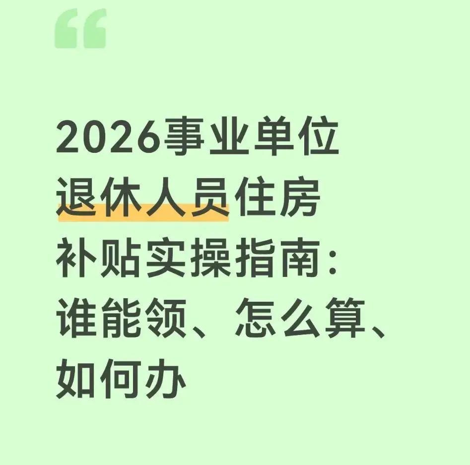 很多事业单位退休的老同志,退休后可能多出一笔住房补贴,少的几万,多的能到二三十万,这笔钱是当年房改时国家给的货币化补偿,专门针对没分到够面积福利房的编制内人员。 现在2025-2026年政策还在执行,核心就两条硬杠:一是必须是机关事业单位正式在编退休的,编外、合同工、改制成企业的都不行;二是本人和配偶的家庭住房情况“未达标”,也就是没享受过福利分房、房改房、集资房,或者享受过但面积不够对应职级标准(比如处级一般80-90平,厅级100-120平,科级60-70平左右,各地略有区别)。 商品房自己买的再多都不影响资格,只认政策性福利房。夫妻双方都退休的,按职级高的一方标准算,如果一方达标了,另一方没达标的还能单独申请全额或差额,这点很多人容易想歪。 金额怎么算?主要看三样:职级高低、工龄长短、缺口面积大小。工龄越长越划算,很多地方满30年拿全额,25年可能打9折。发放方式各地不同,有的一次性发,像北京、上海等大城市基数高,无房户能补十几万到三十万不等;有的按月发,退休后每月多几百到一千多,随养老金走,最多发几年或到一定年限停。 想领的话得自己主动办,退休后一般1年内申请,逾期多数地方不补。流程简单:先打12333或12345问本地细则,再去原单位人事科或住建窗口提交身份证、退休证、无房证明(房产中心开,含配偶)、工龄职级证明等材料。单位审核公示后,上报财政,快的1-3个月钱就到账。 这笔钱来源稳,财政或单位售房款专款专用,符合条件的别犹豫,早问早办,能补的损失就小。赶紧查查自家情况,别让该得的福利睡大觉事业单位退休金 退休补贴 北京公房房改