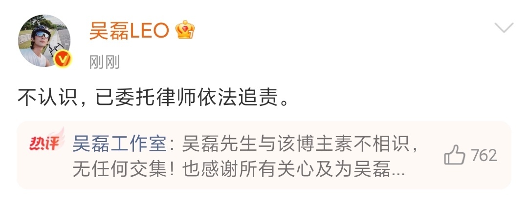 吴磊本人辟谣近日网络谣言, 吴磊回应不认识并委托律师维权。