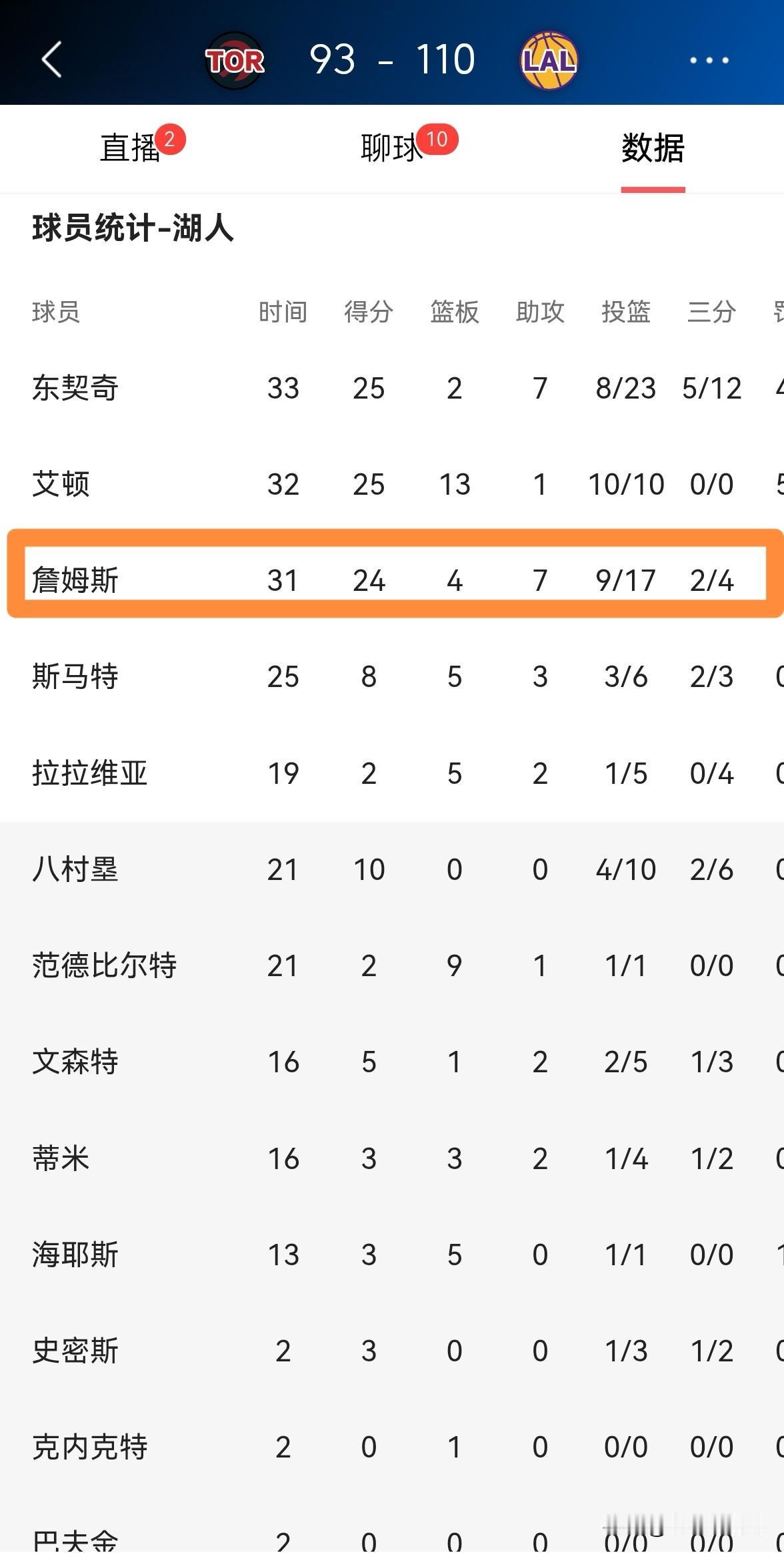 我真的对湖人巨星詹姆斯的出色感到无语了!在今天湖人主场以110:93轻取猛龙的比赛中,41岁的詹姆斯在背靠背的比赛中打出了让人非常惊叹的表现。整场比赛下来,詹姆斯首发出战31分钟,投篮17中9,其中三分球4中2、罚球4中4非常高效的砍下24分,还有4篮板7助攻2盖帽,他的场上正负值为+18。 虽然我们早已经习惯了詹姆斯的出色,但是我必须要称赞一下詹姆斯今天的防守,此役詹姆斯在防守端的投入度非常高,让人依稀看到了他巅峰时期的影子。