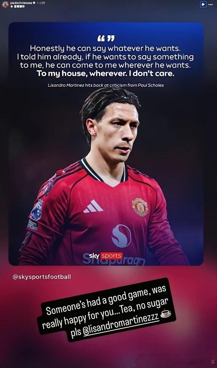 利马一点面子都不给名宿,坚决回怼!曼市德比之前,曼联昔日名宿保罗·斯科尔斯质疑利桑德罗·马丁内斯的能力,认为对方无法限制进球如麻的哈兰德,但是比赛结果狠狠打脸斯科尔斯。比赛结束,曼联2-0击败曼城,不仅仅做到零封对手,利马也能彻底冻结哈兰德,让挪威前锋全场毫无作为,利马在社媒回复斯科尔斯的嘲讽,表示斯科尔斯如果想说什么可以去他家。最终斯科尔斯认怂,并表示“有人踢了一场好球,真的为你感到高兴……来杯茶,不加糖,谢谢☕️”。值得一提的是,曼联俱乐部也对名宿的言论非常不满,认为他们没有为球员提供建设性意见,而且唯恐球队还不够乱。足球英超曼联