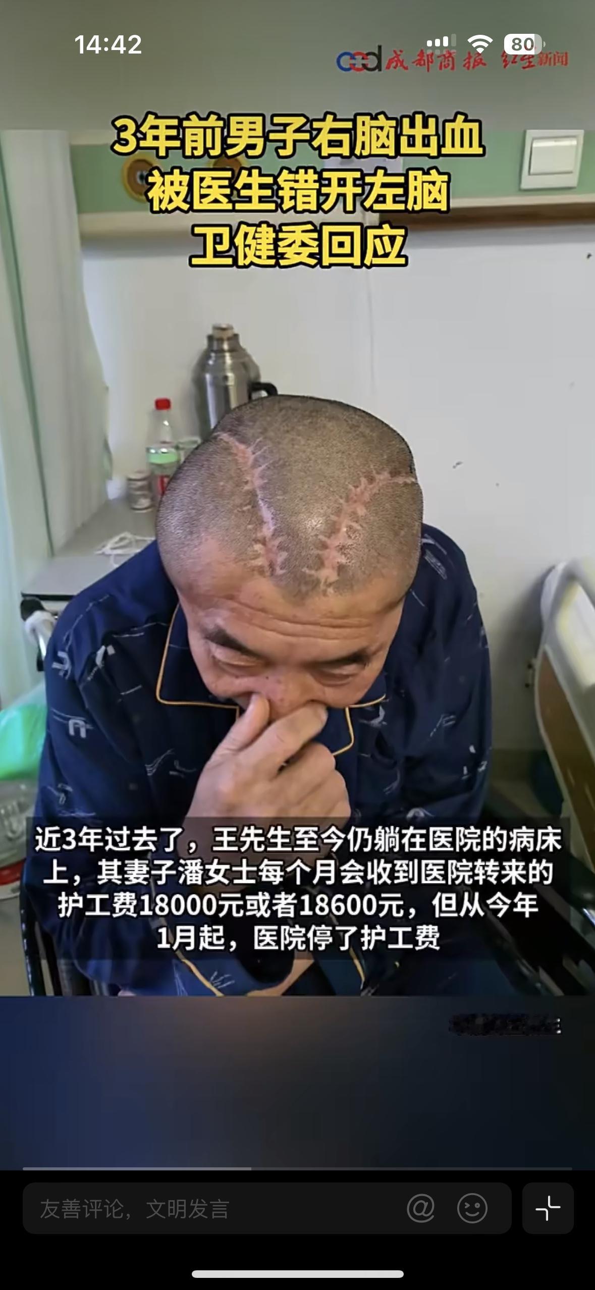 说句难听的话!没那金刚钻别揽瓷器活儿,这不是拿人命开玩笑嘛? 53岁的男子右脑出血,却在手术中被医生开成了左脑,发现错误后又重新开了右脑!脑袋上两道蜈蚣一样的疤痕,导致他在icu 住院80多天,家里掏空了家底还不够花了160多万 可医院却死不承认开错了,直到妻子拿着ct去别的医院专家肯定了是开错了!他们才承认,左右都弄错了,这不就是医疗事故吗?直到现在,该男子还躺在医院的病床上!提出让医院赔偿金额300万,他们却拒绝,啥人还能偿命,医院看错了病,好好的右脑被开错了,却一点代价都没有?
