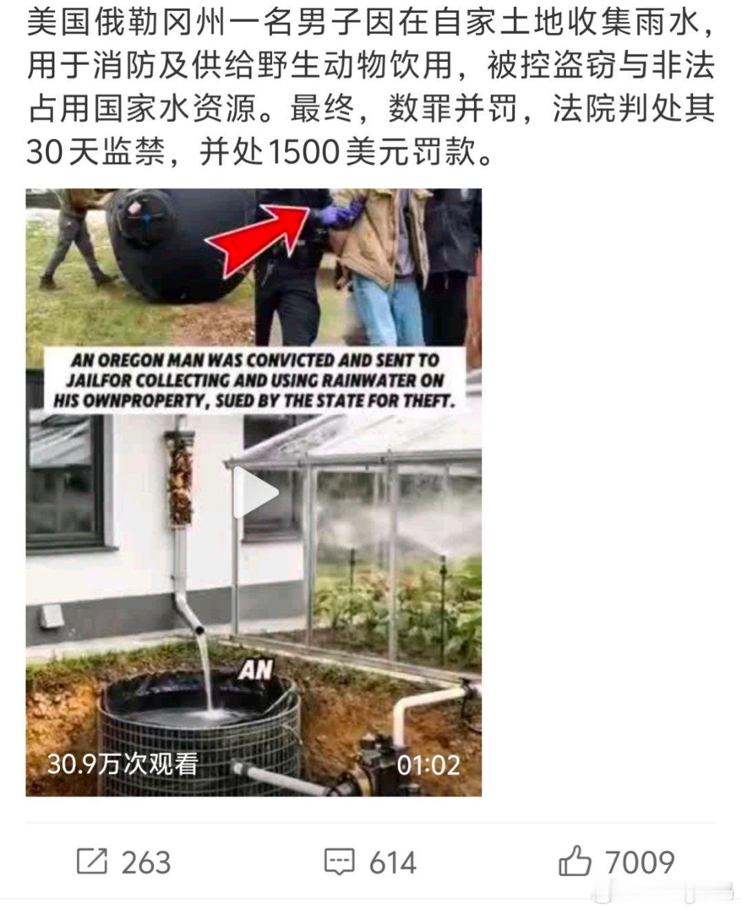 美国男子收集雨水被判处30天监禁这就是自由之地么?收集雨水都不给了