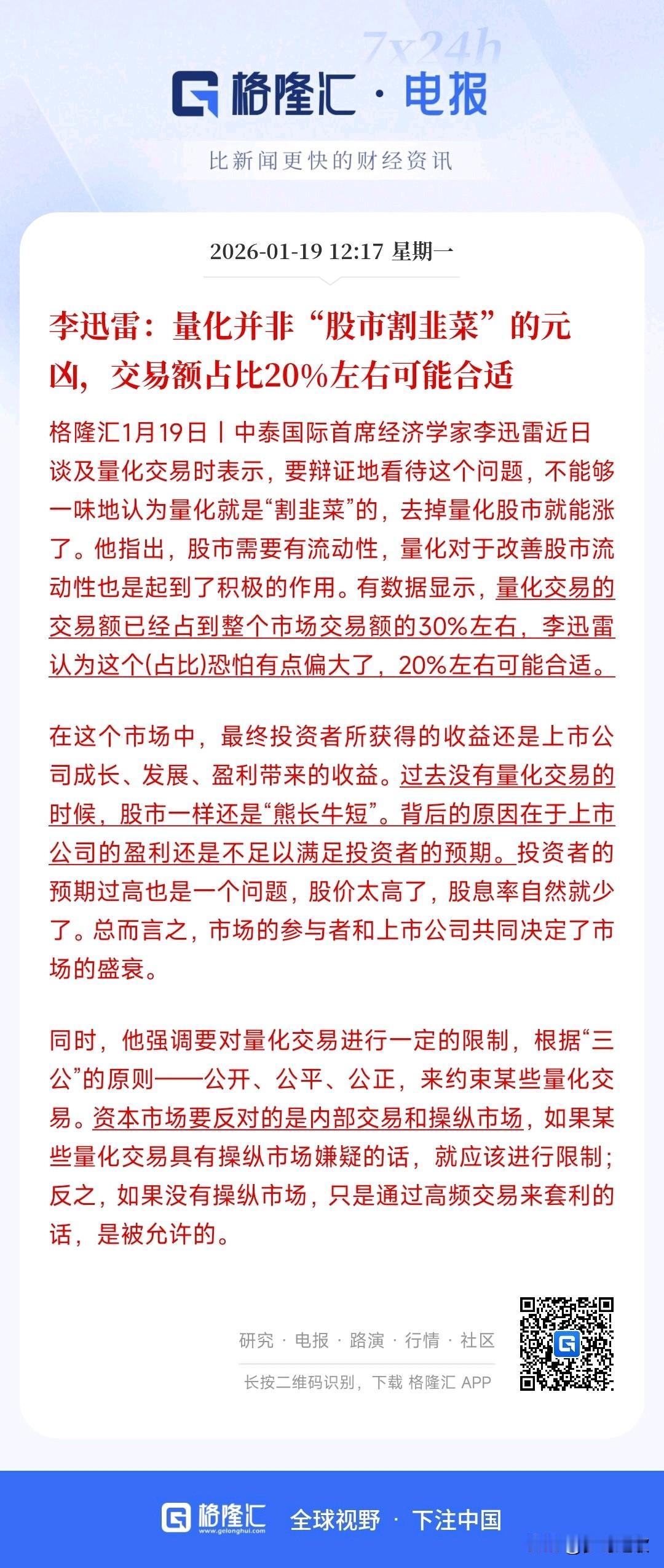 有人为量化站队了,认为股市涨不起来并不是量化的错 专家认为:A股熊长牛短并不是量化的错,反而量化交易还为市场增加了成交量,而且超过20%以上。 而A股不能走出牛市或者散户赚不到钱的原因主要是A股公司的盈利达不到投资者的预期。 事实上,量化现在已经成为了散户的对手盘,在牛市当中还好,量化的作用是积极的,但是在指数出现调整的时候量化就会反复收割散户,成为砸盘的主力。 再看看量化基金的收益率普遍在50%以上,就可以看出钱基本上都被收割了,不然持续50%的收益哪来的?量化现在真的有点令人厌恶了。