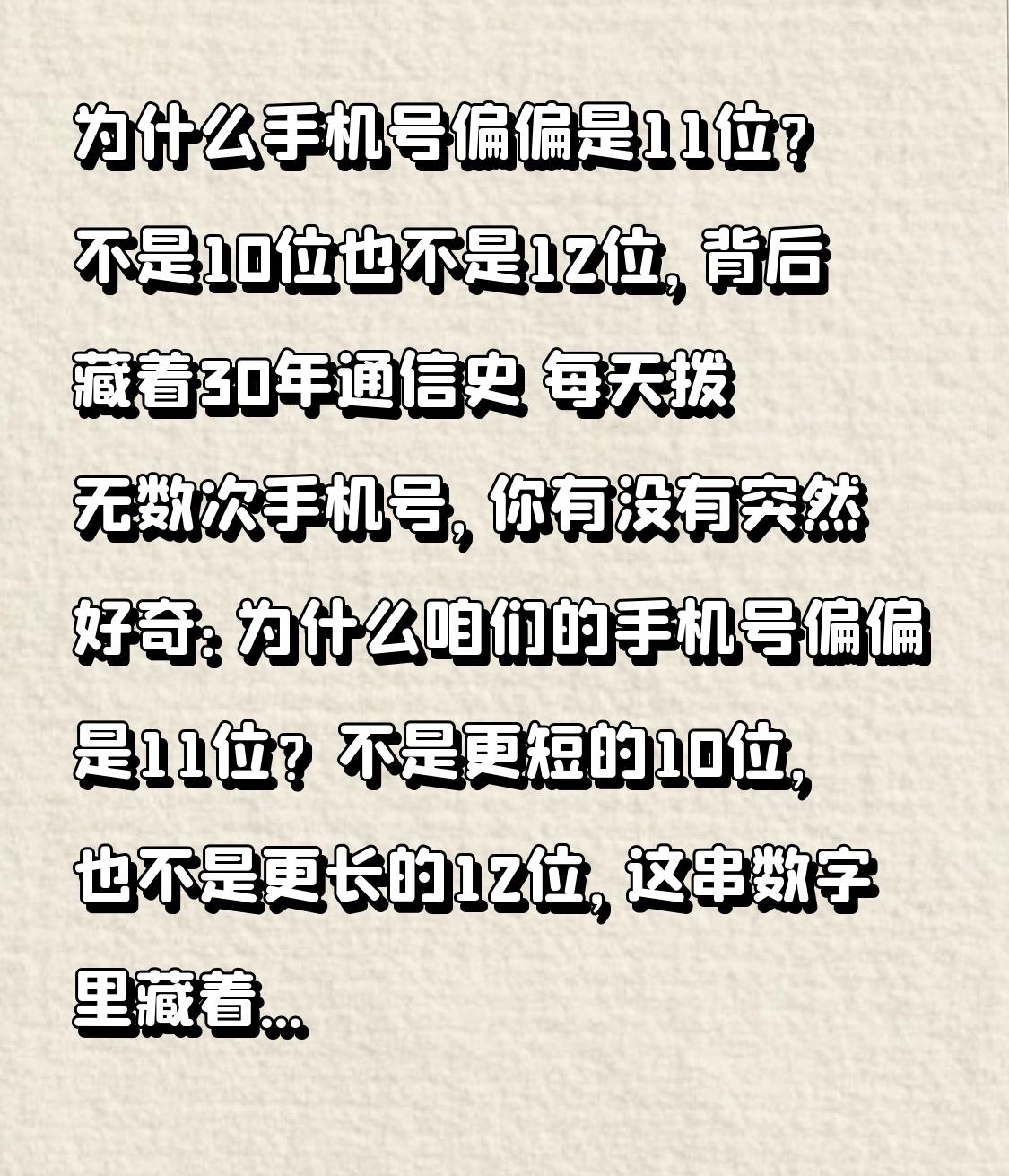 为什么手机号偏偏是11位?不是10位也不是12位,背后藏着30年通信史 每天拨无数次手机号,你有没有突然好奇:为什么咱们的手机号偏偏是11位?不是更短的10位,也不是更长的12位,这串数字里藏着你不知道的时代密码!刷到这条视频,终于能把这个疑惑说透了! 很多人觉得11位手机号难记,可你不知道,最早的手机号根本不是这样。1987年“大哥大”刚出现时,手机号只有6位,比如经典的“901088”,当时能拥有的人比现在开豪车还稀罕。到了90年代,数字手机普及,手机号涨到10位,以“13”开头的号段火遍全国,可没几年就遇到了大麻烦——用户爆发式增长,10位号码根本不够用,1998年就面临“无号可放”的困境,运营商急得团团转 ! 这就是关键转折点:为了解决“号码饥荒”,1999年7月22日,我国正式把手机号升级为11位,最聪明的是升级规则超简单,比如老号139XXXXXXX,直接在第3位后加个0,就变成了1390XXXXXXX,大家不用重新记号,还能瞬间扩容10倍!而且11位是经过精准计算的最优解:前3位是运营商识别号(比如139属移动、130属联通),中间4位是地区编码(相当于手机号的“籍贯”),最后4位是用户专属号,三段式结构既方便管理,又能避免和110、120等特殊号码冲突。 更厉害的是,11位号码的容量直接拉满!理论上有100亿种组合,哪怕14亿人每人分7个号都够用,还为5G、6G时代预留了空间。反观欧美国家,手机号多是7-10位,根本扛不住中国的人口规模和通信需求。当年联通为了升位,光改造设备就花了1.5亿元,可见这串数字背后的技术投入有多扎实 ! 现在我们觉得11位手机号理所当然,可这背后是中国通信从6位模拟号到11位数字号的逆袭,从“大哥大”时代的700个用户,到如今17.8亿移动用户,11位手机号见证了全民通信的普及,也藏着科技发展的速度 。 你还记得自己第一个手机号是多少吗?是139开头的老号,还是后来的新号段?评论区晒出你的手机号开头3位,看看哪个运营商的老用户最多!点赞转发,让更多人知道这11位数字里的时代故事!
