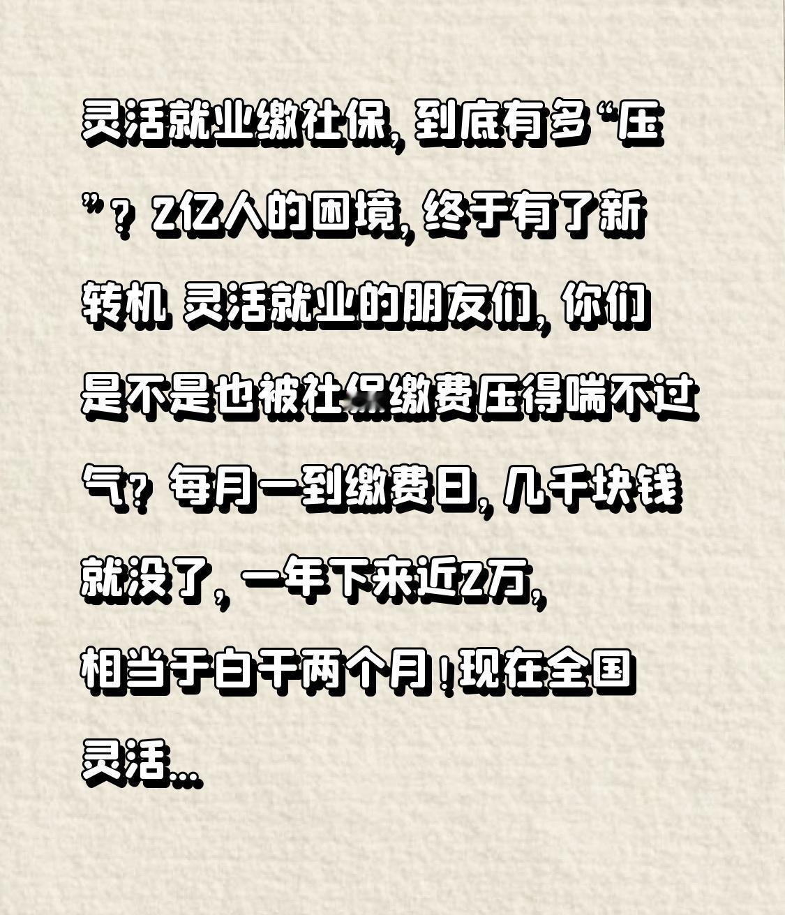 灵活就业缴社保,到底有多“压”?2亿人的困境,终于有了新转机 灵活就业的朋友们,你们是不是也被社保缴费压得喘不过气?每月一到缴费日,几千块钱就没了,一年下来近2万,相当于白干两个月!现在全国灵活就业人员超2亿人,大家都在纠结:缴吧,压力太大;不缴,老了没保障。今天就聊聊这扎心的现实,还有你不知道的减负好消息! 很多人以为灵活就业社保和上班族一样,其实差远了!上班族养老社保个人只缴8%,单位帮担16%;可灵活就业者得自己扛20%,相当于一个人交两份钱。以上海为例,按最低基数缴费,每月要掏1800多,占外卖骑手、网约车司机月收入的30%,这还没算医保。更让人无奈的是,缴的钱里只有8%进个人账户,剩下12%都划入统筹,等于每交1000块,600块都要“统筹”出去。 我认识一对夫妻,两人都灵活就业,社保交了十多年,以前每年加起来不到2万,现在涨到3万多。本来盼着缴满15年就解脱,结果新规说2030年起缴费年限要逐步延长到20年,延迟退休还在路上,夫妻俩算了算,要交满得花60多万,比房贷还让人焦虑——房贷有明确年限,社保却充满变数,不知道未来还要多交多少。这就是无数灵活就业者的困境:缴着最累的费,扛着最不确定的未来。 但关键转折点来了!国家和平台都开始出手减负了!2025年起,美团、京东等平台陆续推出社保补贴,骑手满足稳定兼职条件,就能领到50%的养老保险补贴,一年能省近6000元。各地也有“真金白银”的福利:就业困难人员、“4050”人员能领缴费额50%-70%的补贴,商丘每月补300元,最长能领3年,大龄人员还能领到退休。更贴心的是,缴费基数能在60%-300%之间自选,预算有限就选下限,压力小还能累计年限;收入提高了再上调,性价比最高。 给大家整理了3个避坑减负技巧,直接能用: - 先保医保再保养老:医保断缴次月就不能报销,养老可以后续补缴,优先确保医保不断档; - 主动领补贴:别错过“4050”、高校毕业生等补贴,到街道办或线上就能申请,白拿的福利别浪费; - 别盲目选高档:预算有限就按60%下限缴,缴满20年比按300%缴15年,养老金差不了太多,压力却小一半。 其实灵活就业者缴社保,图的就是一份安心。我们不怕辛苦赚钱,就怕付出没保障、压力没处减。现在政策越来越暖,平台也在发力,这些改变正在让“灵活就业”不再意味着“无依无靠”。 你是灵活就业者吗?正在缴社保还是纠结要不要缴?想知道自己能领多少社保补贴?评论区留言你的情况,我帮你查当地政策,点赞转发,让更多灵活就业的朋友知道这些减负好消息