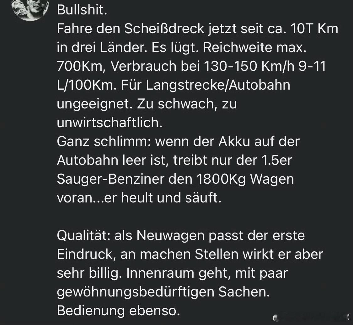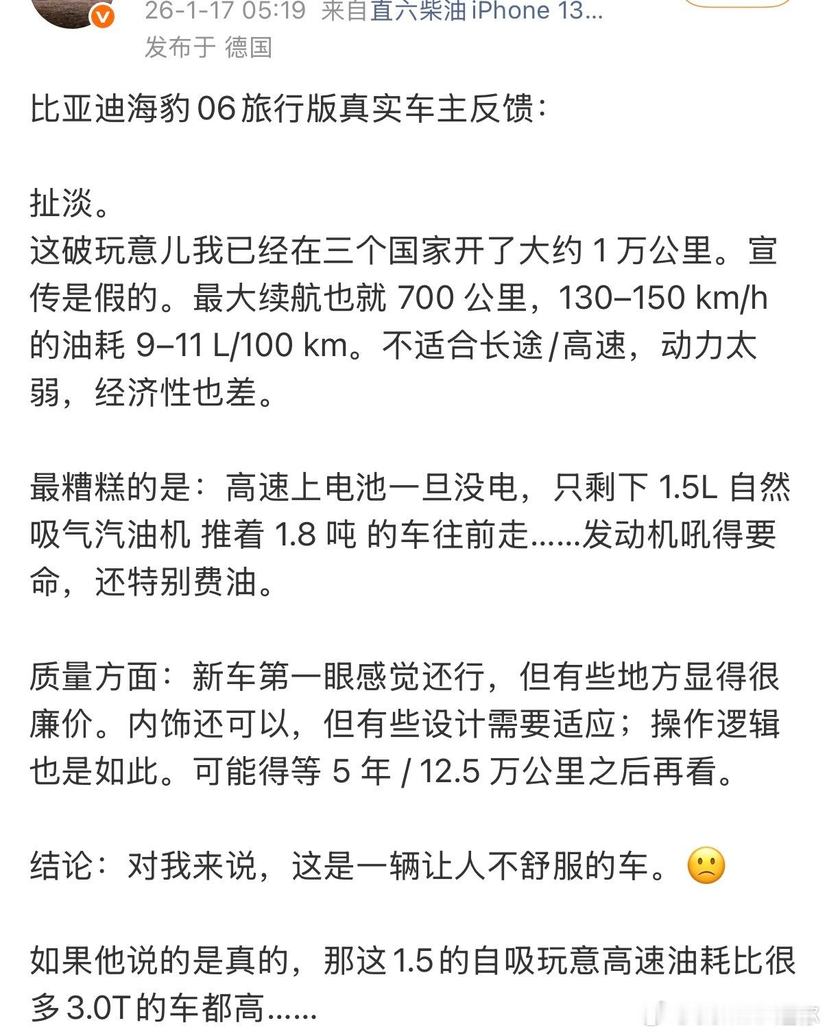 一个欧洲佬的评价,竟然也能让某些人沸腾……这种东西但凡是个主流媒体在国内发布,都得被网信处理,如此明显的“以偏概全”还有人奉为圭臬按照这种逻辑,那欧洲车在中国的宣传也全是假的了,宣传油耗都是七八升,每天城市通勤都得十几升……而且欧洲市场也不是大家天天跑高速,欧洲市场城市高速73开,中国82开,最高的美国也就基本55开,一谈能耗就是高速,这不是以偏概全是啥?前阶段被处理的垂媒中已经提醒的很明显了,不要搞以偏概全的汽车评测比亚迪海豹06汽车资讯大v聊车