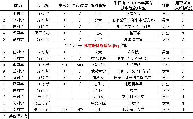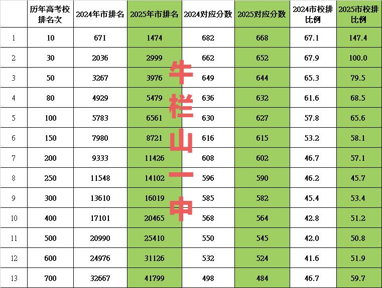 牛栏山一中近两年高考成绩,虽说整体上还是可以的,但学校2025年高考在全市的竞争力比2024年下降了。你在进步,但可能别人进步的比你更多。 从近两年高考市校排比例系数对应表中,梳理出几个明确的结论: 1. 校内相同名次的全市竞争力下降 对比2024和2025年的市排名:相同校排名次下,2025年的市排名数字显著变大(例如校排前10名,2024年对应全市第671名,2025年对应第1474名;校排前30名,2024年对应第2036名,2025年对应第2999名)。市排名数字越大,代表在全市的位置越靠后,这说明牛栏山一中相同校内名次的学生,在2025年的全市竞争力有所下滑。 2. 高考对应分数普遍下移 2025年各“历年高考校排名次”对应的分数,均低于2024年,降幅在4~18分之间: 校排前10名:682分(2024)→ 668分(2025),降14分;校排前700名:498分(2024)→ 484分(2025),降14分。这一现象反映出2025年高考整体分数段下移,可能是试卷难度提升,或是全市考生分数分布发生了变化。 3. 市校排比例揭示整体竞争表现下滑 表中的“市校排比例”2025年的比例普遍高于2024年(如前10名比例从67.1升至147.4,前30名从67.9升至100.0),说明相同校内名次对应的全市排名,相对历年校排名次的倍数更大,学校整体在全市的竞争表现有所下滑。靠前的校排名次(如前10、30名)更直观更明显。 因为以上,牛栏山一中2025年高考录取结果也就差一些,头部生源由2024年的11个清北到2025年的5个清北,而且25年被录取的专业也相对不那么热门。 2025年牛栏山一中秋季开学就换了新校长,从顺义教委副主任位置上过来的,最初原是仁和中学的校长。能把仁和中学带到顺义超一流,应该还是有些能力的,希望也能把牛栏山一中带到更好的水准,重现本世纪之初那些年的辉煌。
