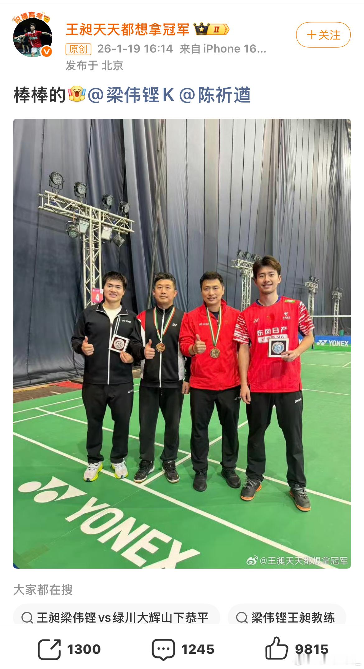 王昶发文庆祝新年首冠 恭喜梁王拿下2026年首冠!迎来了2026开门红,一个吉祥又美好的兆头!未来请继续健康涨球!多拿冠军!加油!