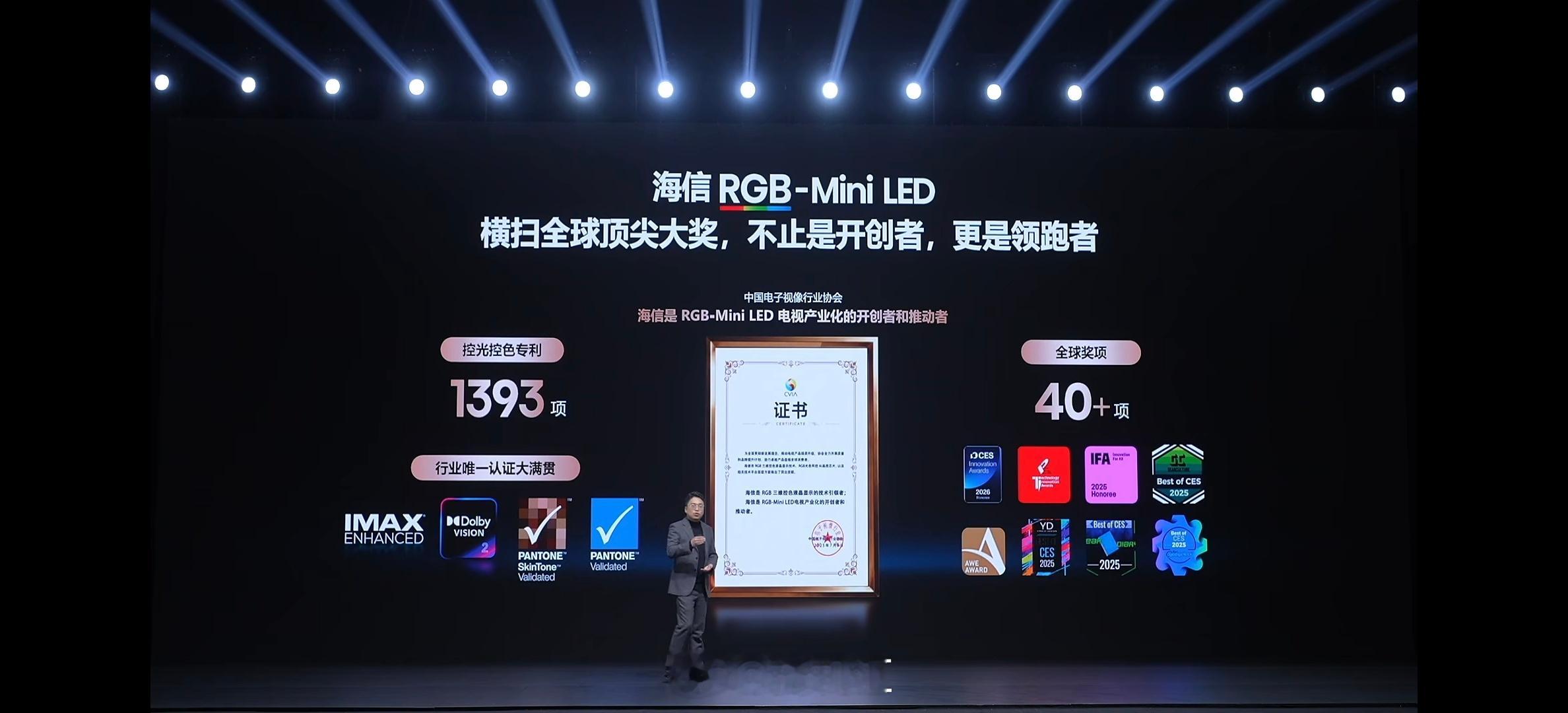 海信 RGB-Mini LED确立全球高端显示的"中国标准"。控光控色专利1393 项,全球奖项 40+项