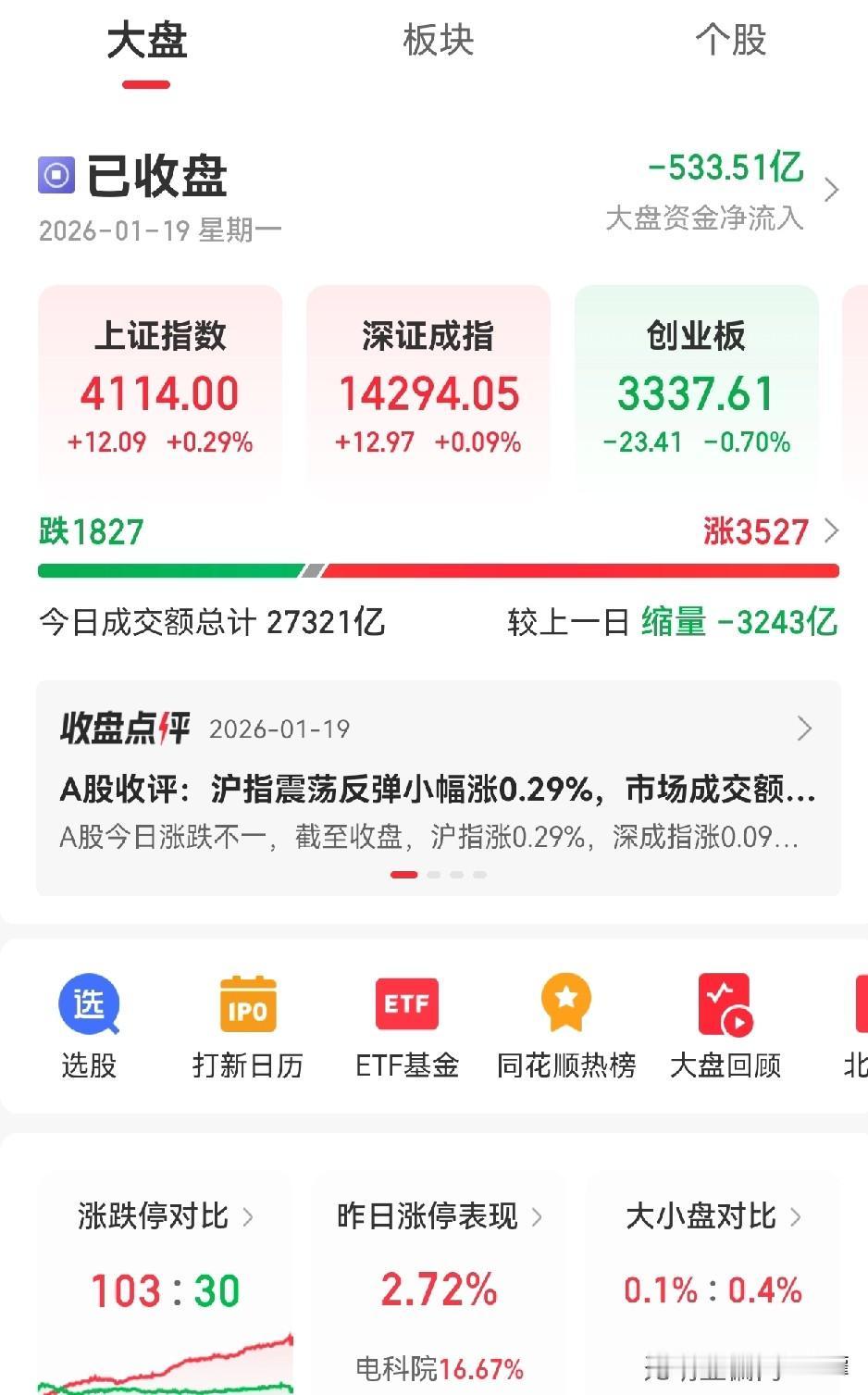 指数层面,从1月13日开始就有所降温,涨久必跌,也符合常理。另外,证监会最近给股市定了一个基调:“稳字当头,并且强调要严肃查处过度炒作乃至操作市场等行为,坚决防止市场大起大落”。同时各大券商也下降了保证金比例。 从消息面上,指数降温是必然的,从成交量来看,今日缩量3000多亿。 那么,前期涨的很好的商业航天、脑机接口、CPO等板块最近还是规避一下的好。 虽然今日商业航天有所反弹,但还是等一段时间后再说,毕竟散户最怕的还是在高位站岗。 再回到指数,本周上证指数和创业板指数预计是震荡向下的趋势,或许在20均、30均会得到支撑。 北证指数目前也没有企稳向上的迹象。 今日两市上涨3500多家,下跌1800多家,盘面总体还是可以,算不上好,但也不差。 今天没赚钱的股友不用羡慕赚钱的,今日绿的票明后天大概率会出现阳线。 所以,“轻指数、重个股”是操作思路依然有效。 针对现在的行情,指数型的基金可以规避一下,毕竟上涨趋势不明,买进入盈利的概率不大。 对于高位股依然采用规避的态度。 对于有题材的低位股,比如机器人、AI应用、算力、芯片板块业绩好、位置不高的个股,可以格局,股市大概率会从高位股轮动到低位股上。 A股指数 大盘行情 大盘分析行情 股市行情指数 指数要回落
