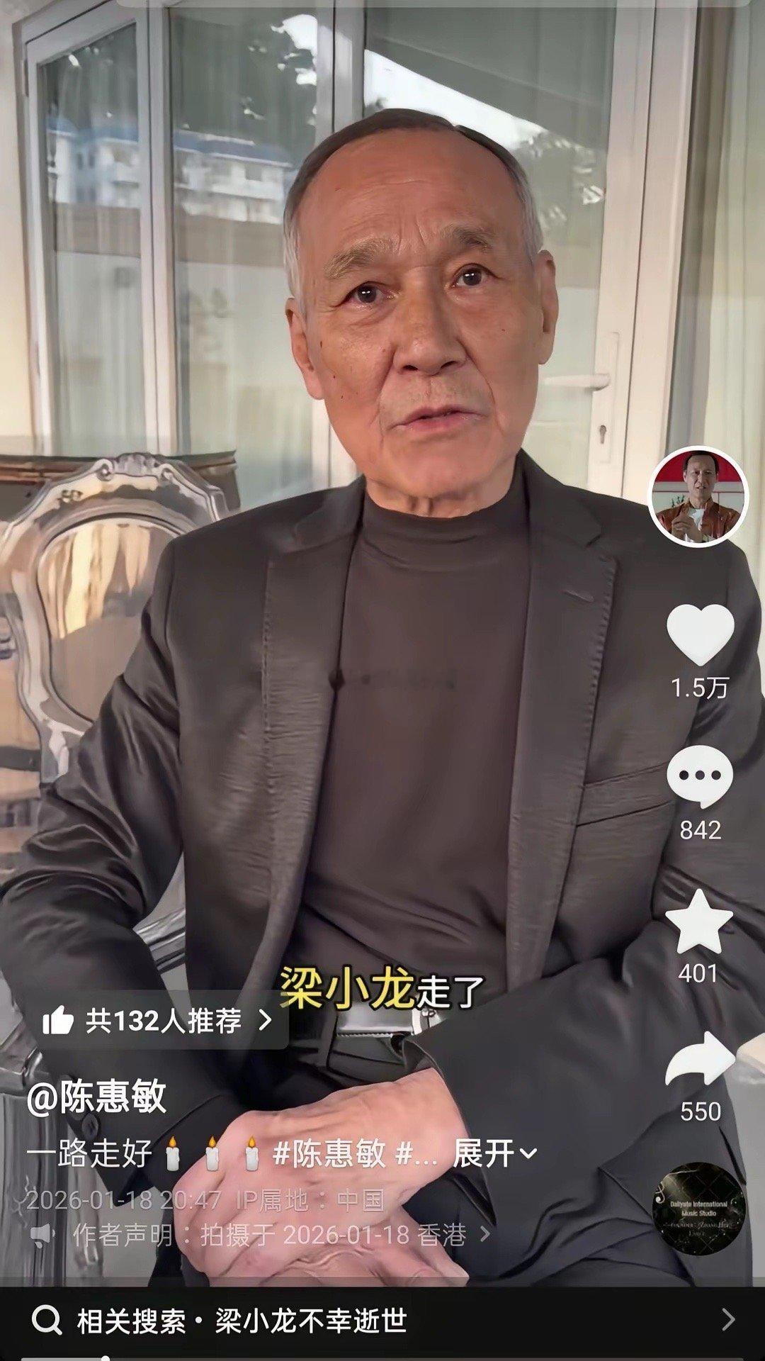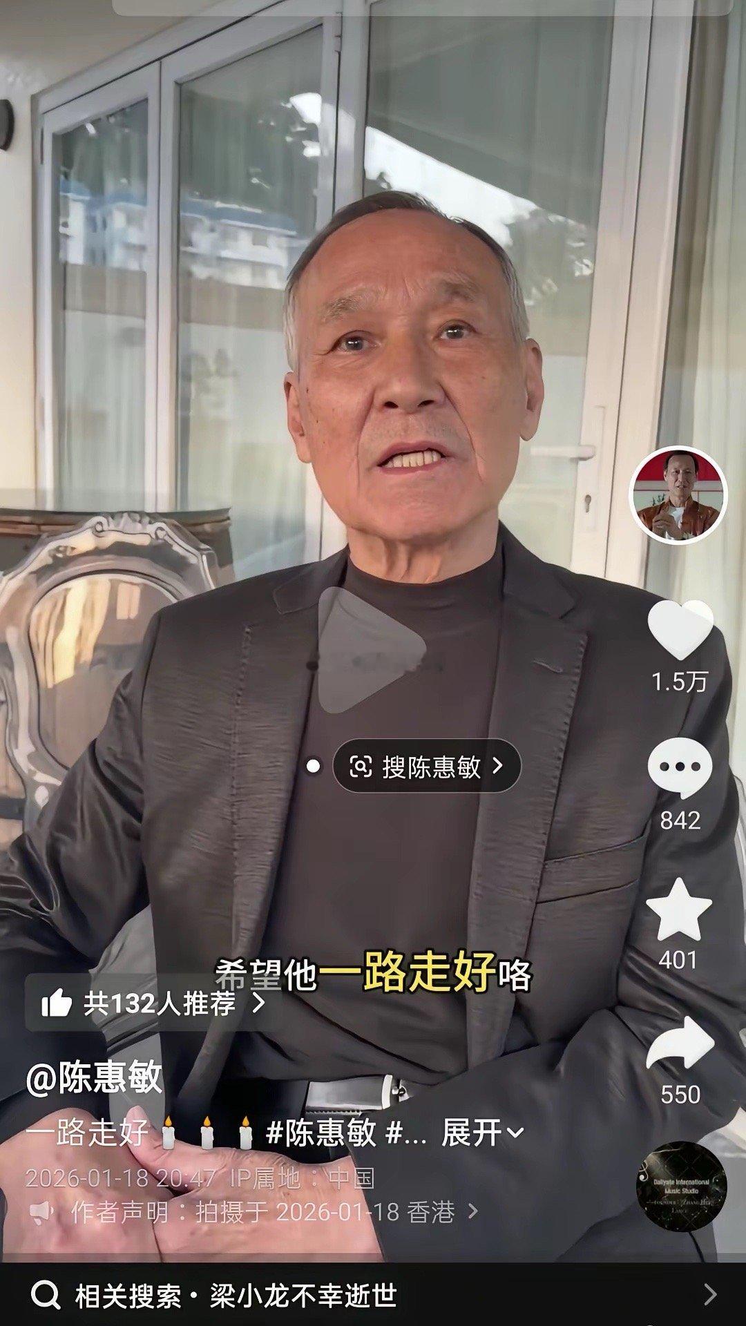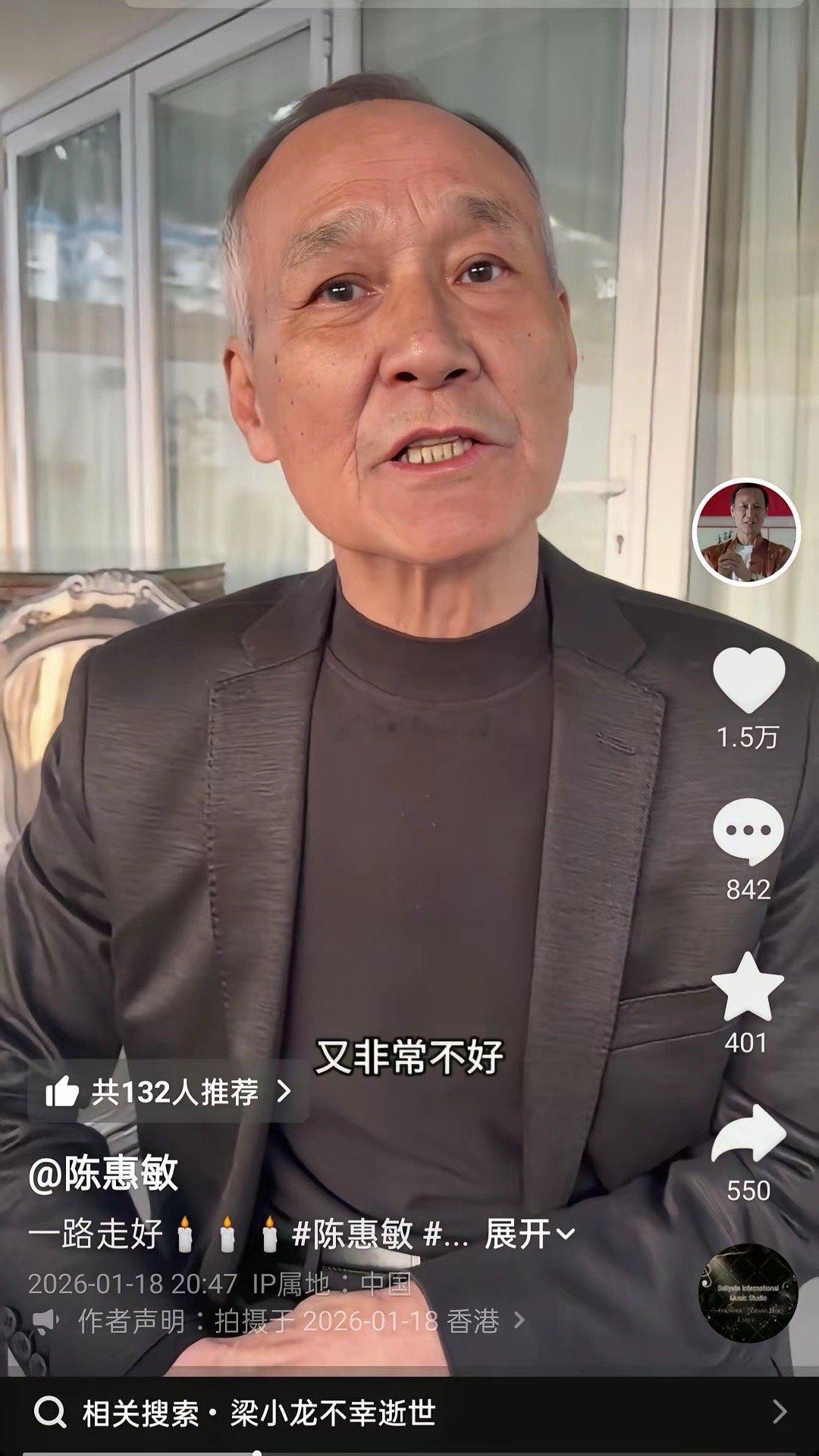 没想到,梁小龙竟然是香港大佬陈惠敏的结拜弟弟。1月18日,80岁的香港大佬陈惠敏,在个人社交账号上发视频说,梁小龙是自己的结拜弟弟,但是令人觉得疑惑的是,就在77岁的梁小龙去世3天之后,他这个结拜哥哥才收到消息,保密工作也做的太好了吧!在得知结拜弟弟去世的消息后,陈惠敏的心情是非常不好的,震惊与哀伤难过溢于言表,就连说话的时候声音都是颤抖的,甚至变得吞吞吐吐,口吃起来。可见,他与梁小龙的结拜情谊还是很深厚的,但是生老病死没有人能阻挡,事已至此,陈惠敏除了哀伤悼念之外,也只能说一句:希望他一路走好了!