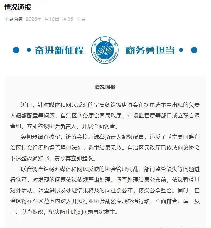 宁夏餐饮饭店协会这事儿闹得挺大,一个地方行业协会居然冒出89个副会长,简直让人看傻眼。事情发生在宁夏,去年4月他们换届选出会长1人、常务副会长10人、副会长28人,后来又补了42个副会长,今年1月9日再补9个,加起来就凑到89个,还不算另外10个名誉副会长。按宁夏民政厅的规定,协会负责人总数最多只能40人,还得是奇数,这明显超标太多,严重违规。 官方反应很快,1月18日自治区商务厅、民政厅、市场监管厅等部门组成联合调查组,直接认定选举结果无效,责令协会马上整改,还暂停了他们对外一切活动。调查组继续深挖管理乱象和监管漏洞,承诺有问题就严肃处理,结果会公开接受大家监督。自治区还决定在全区推开行业协会专项整治,查一遍改一遍,避免类似荒唐事再冒头。 这种负责人超配的现象,暴露了部分协会管理太随意,把头衔当福利发,偏离了服务行业、促进行业规范的本职。协会本该帮企业解决实际问题,而不是变成“帽子批发点”。现在官方出手整治是好事,关键看后续能不能真改到位,让行业协会回归正轨,别再让人觉得不靠谱