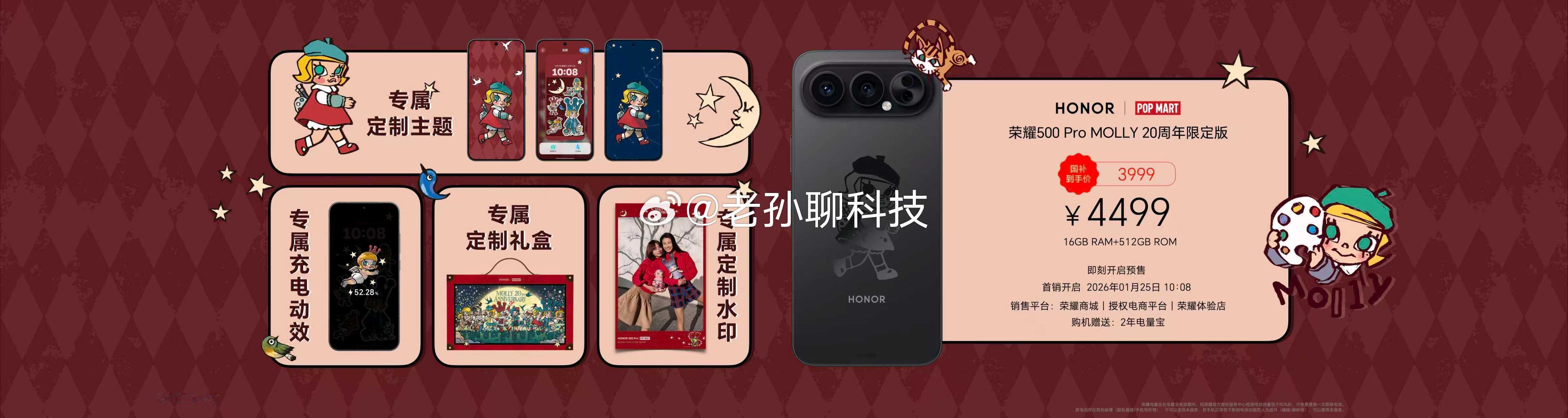 1月23日起,北京、上海等全国100城联动,开启荣耀500 Pro与MOLLY 20周年联名主题店及联名快闪活动!来荣耀门店参与活动打卡,即可获取限量联名周边,购买荣耀500 Pro限定版即赠豪华礼盒!荣耀500 Pro MOLLY 20周年限定版16+512GB,售价为4499元,国补后价格为3999元。1月25日10点08分正式开售。荣耀500ProMOLLY20周年限定版价格公布