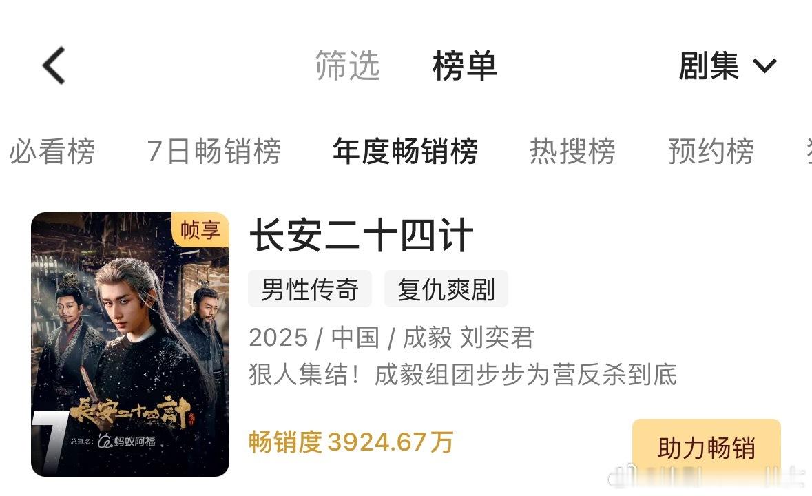 成毅长安二十四计年度畅销榜升至第七,优酷拉新年榜前十唯一一部不是独播剧集,这才28集的体量,多平台分流,剧长尾是真好,弹幕榜第一说明活人观众真多,伟大!寒假快来了,继续为24g奔跑