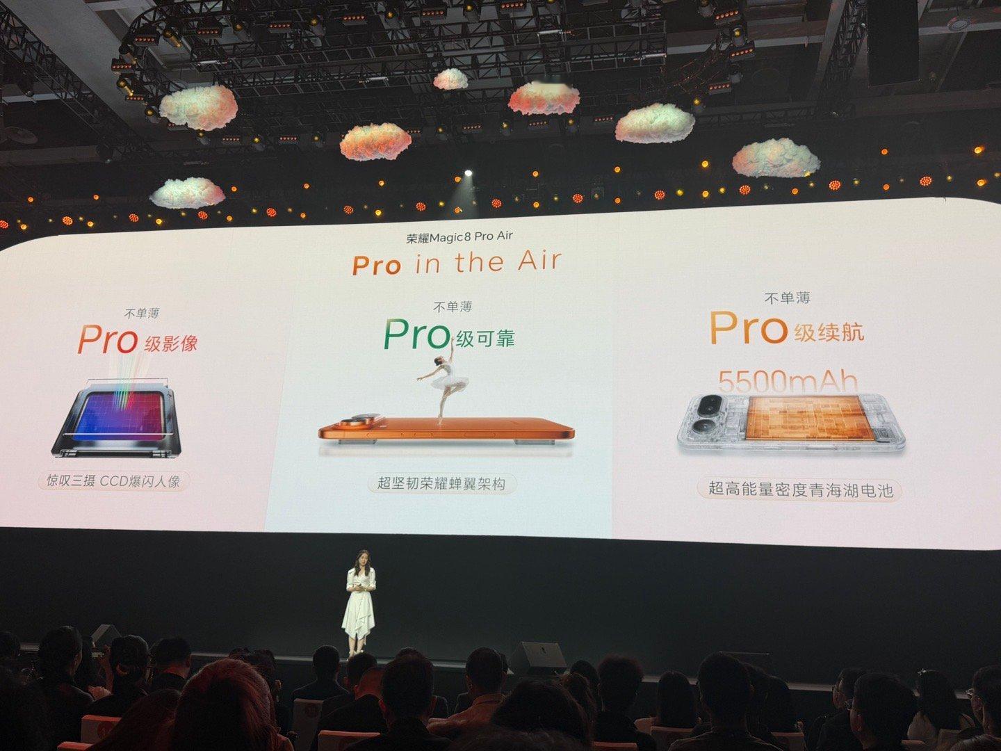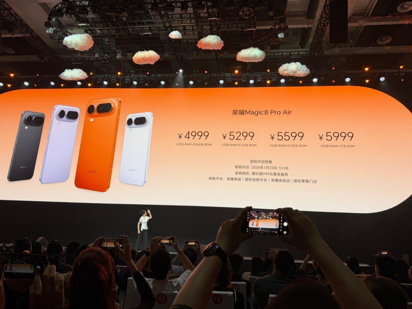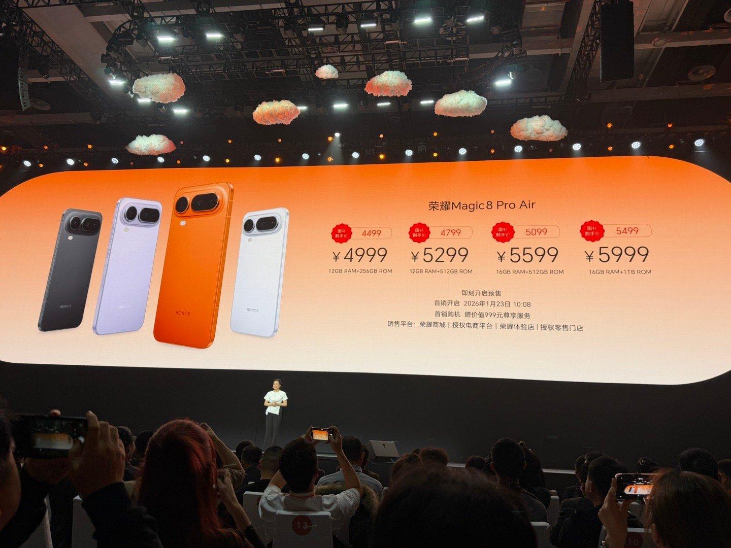 荣耀Magic8 Pro Air售价4999元起,买吗搭载天玑9500平台,配备6.31英寸1.5K 120Hz LTPO自适应四等边直屏,采用金刚巨犀玻璃,拥有6000nits峰值亮度、460PPI、10大绿洲护眼能力、10.7亿色、4320Hz超高频PWM调光及DCI-P3、Dolby Vision认证续航方面内置5500mAh电池,支持80W有线+50W无线快充影像系统前置50Mp镜头,后置主摄、潜望、超广角三摄,搭配5灯阵列闪光灯,支持CCD爆闪人像模式其他配置还包括3D超声波指纹、双扬声器、独立实体AI键、NFC、红外遥控、一体化铝中框(530MPa)、eSIM+实体SIM四卡双待,机身尺寸150.571.96.1mm,重量155g,具备IP68+IP69级防尘防水。
