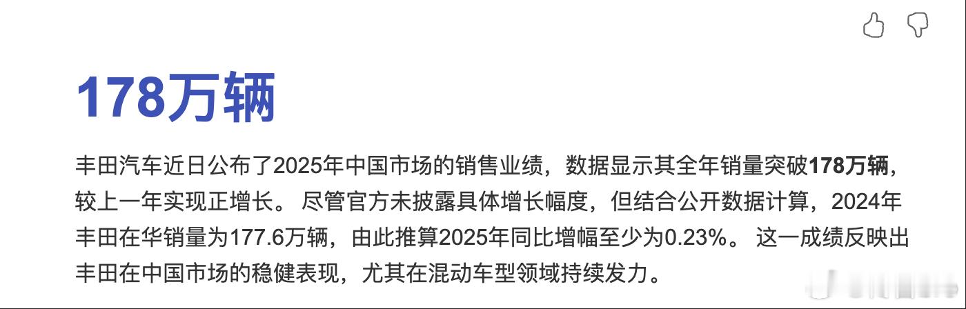 25 年丰田在华销量逆势增长178万(2024 年177.6 万辆)韧性真的牛,新势力现在转型开始学习丰田也证明深耕多年换来的基本盘不是轻易能撼动的接下来的看点在雷克萨斯在华独资厂落地+中国供应链加持这是那个可能改变格局的大招所以不能动不动觉得合资不行手里牌还没打完 丰田