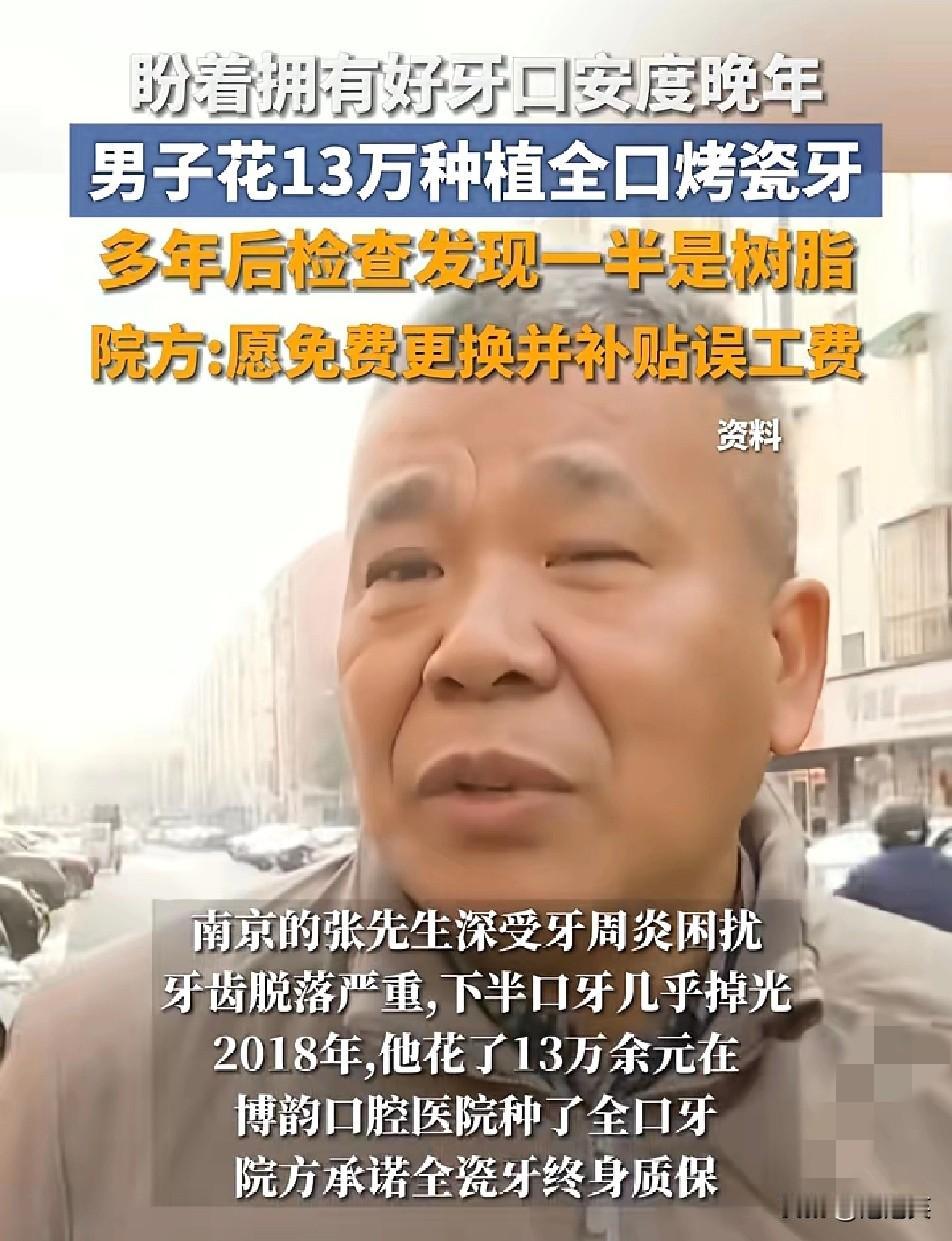 坑惨了! 男子花13万种全口烤瓷牙 多年后发现 一半是树脂😡 南京的张先生为了安度晚年,2018年花13万元在博韵口腔医院种了全口烤瓷牙 院方承诺“全瓷牙终身质保” 多年后他因牙齿频繁卡食物就诊,竟发现下半口牙是树脂材质 面对质疑,院方称当年工艺限制,且下颌项目费用不足以做全瓷牙 愿免费更换并补贴1000-2000元误工费 但张先生认为院方涉嫌欺诈,拒绝接受方案 你遇到过类似的消费陷阱吗?
