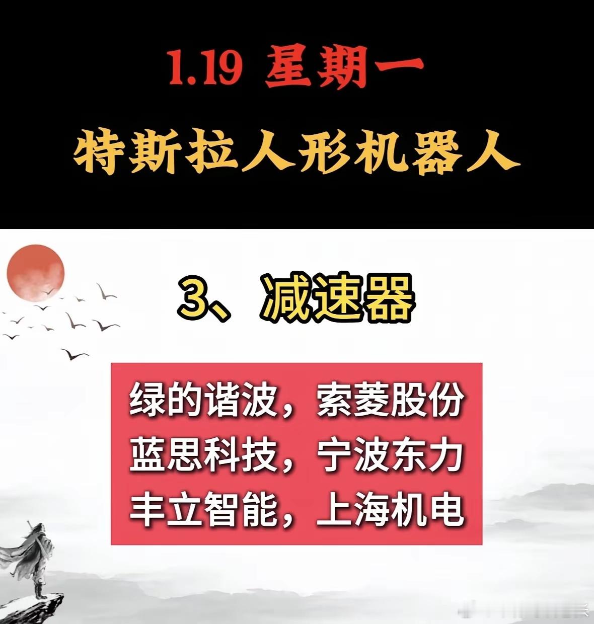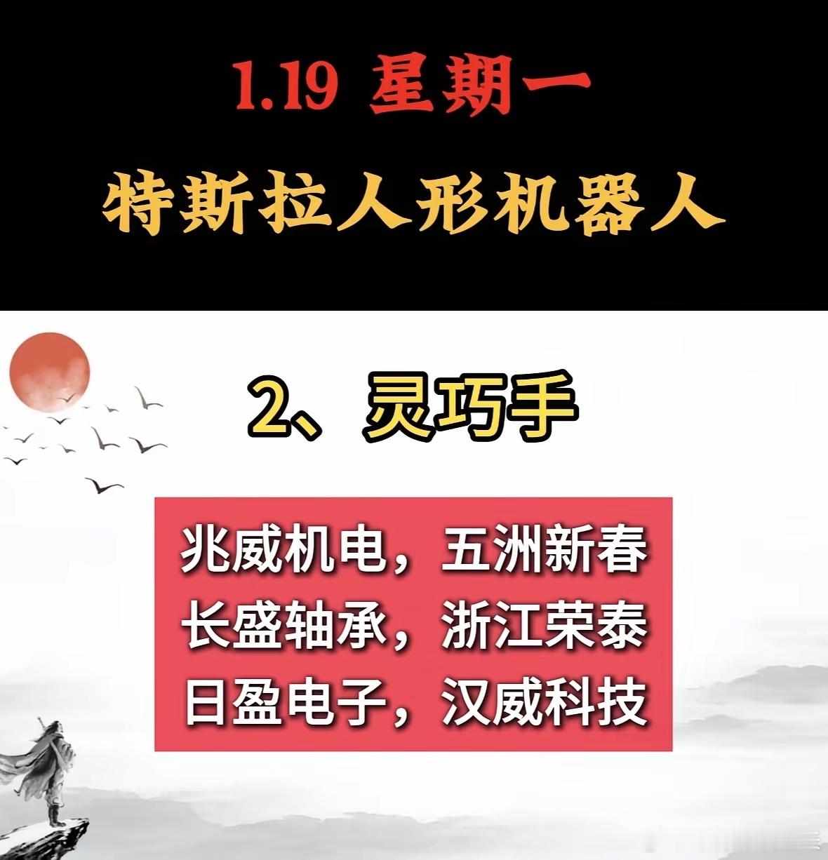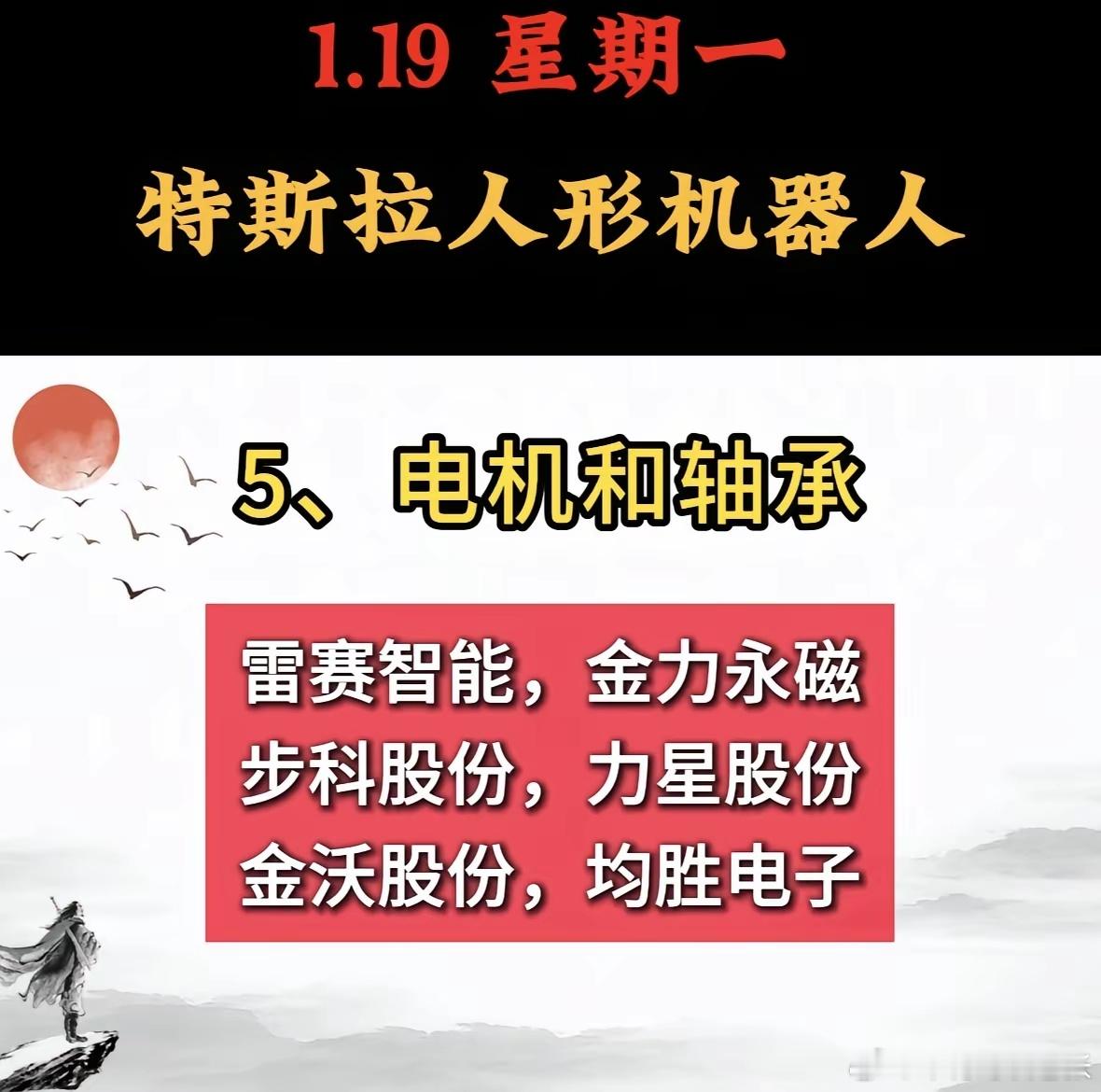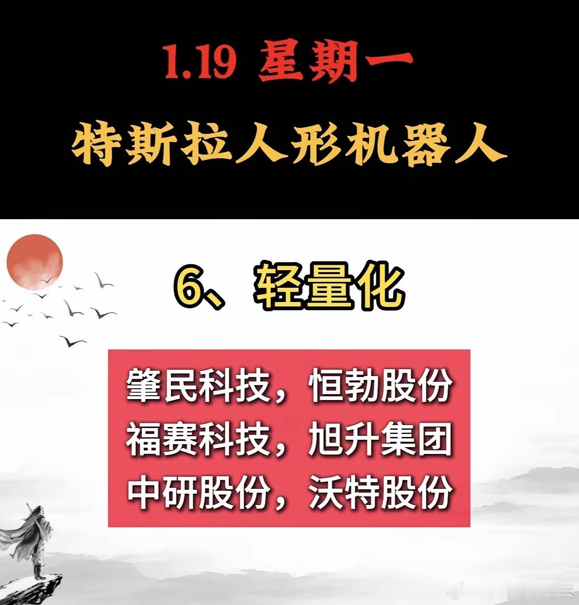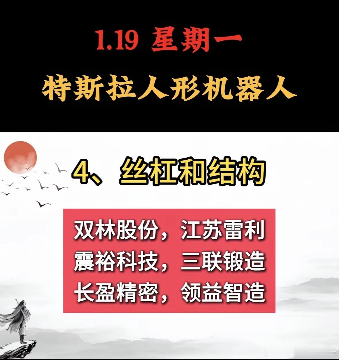 1.19 星期一,特斯拉人形机器人轻量化概念股揭晓!特斯拉人形机器人产业链受关注,关节部件相关企业迎来发展机遇。特斯拉人形机器人产业链受关注,关节部件相关企业引市场热捧,三花智控等公司成焦点。
