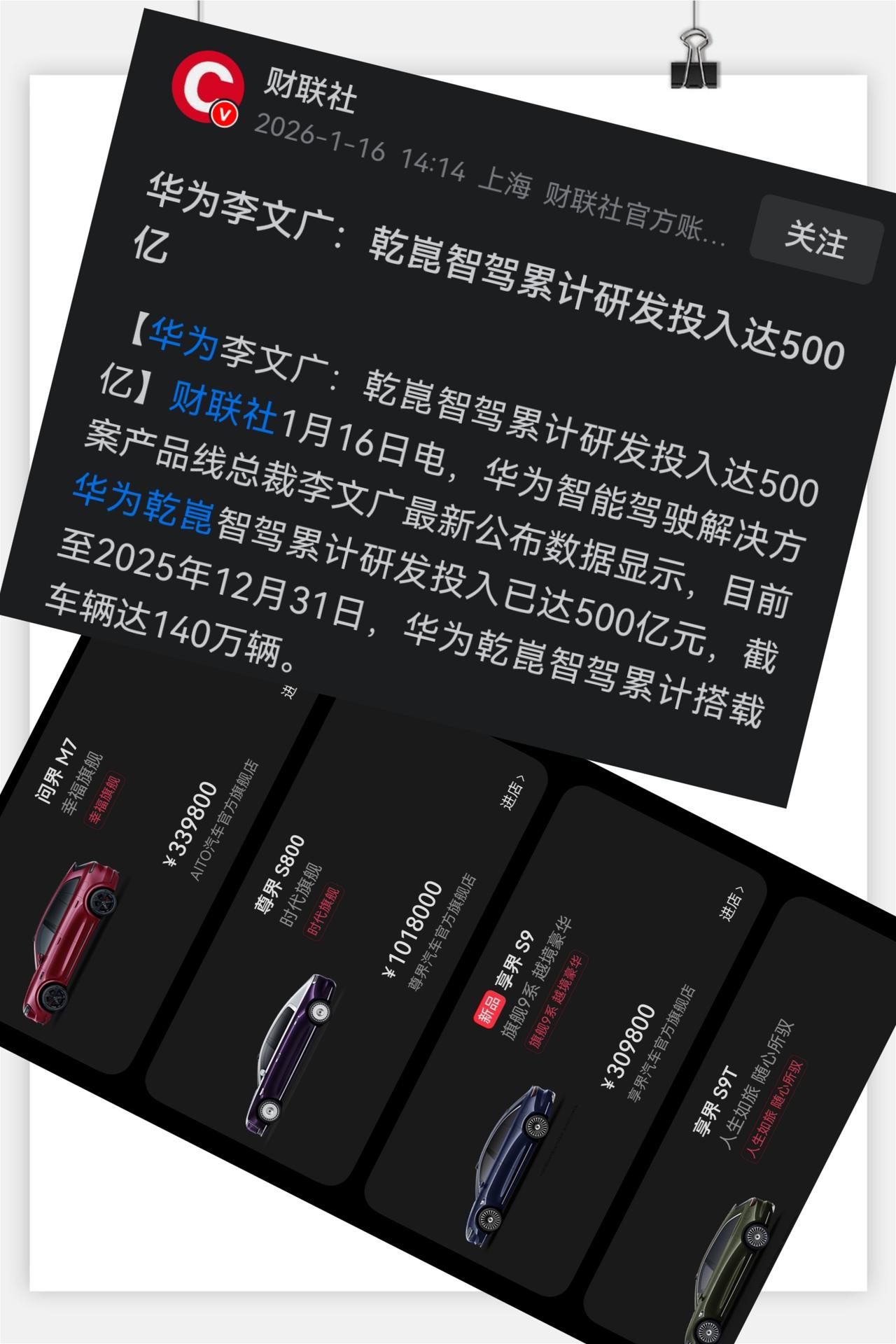 华为的乾坤智驾研发投入都达500亿元了,这是多少车企的数年利润都没有500亿元,怎么跟进?余总曾经说过,智能汽车的研发会拖垮很多企业,还真的没有说错。 主机厂,汽车不赚钱,那就是没有地方来钱了,而华为有很多业务顶上去,对华为而言,暂时不赚钱都无所谓,而且目前还赚钱了。所以打不过就加入吧,那么大投入可不是闹着玩的的~