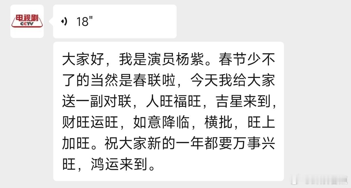 杨紫CCTV新年祝福“大家好,我是演员杨紫。春节少不了的当然是春联啦,今天我给大家送一副对联,人旺福旺,吉星来到,财旺运旺,如意降临,横批,旺上加旺。祝大家新的一年都要万事兴旺,鸿运来到。”杨紫CCTV新年祝福语音杨紫胡歌原声台词爆发力