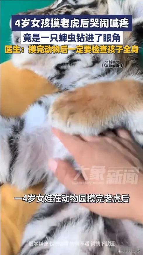 “太可怕了!”近日,河南郑州,一4岁女孩在动物园时摸了小老虎没想到回家后就开始哭闹喊疼,还一直揉眼睛,家长起初以为是被老虎抓伤,但仔细检查后也没有发现伤口,于是便带孩子到医院就诊。网友:被老虎吓着了? 据媒体1月16日报道,医生一检查,发现女孩眼角钻了只蜱虫。这虫子是从小老虎身上跑过来的,趁孩子摸老虎时悄悄爬到脸上,咬进了皮肤里。医生说蜱虫带病菌,要是钻到眼球里或引发感染,麻烦就大了。取虫时不能硬拔,得用酒精先麻晕虫子,等它松口再拿出来,孩子疼得一直哭。 这事一出来,网上吵翻了。有人说动物园不该开放摸幼虎项目,连安全提示都没做到位。也有人怪家长太大意,摸完动物没给孩子仔细检查。不少网友也晒出类似经历,带娃摸完羊驼,回家在头发里揪出好几只蜱虫。 之前有市民带娃露营,孩子跟小狗玩了会儿,洗澡时在脚踝发现一只刚钻进去的蜱虫。后来才知道,硬拔会把虫子口器留在皮肤里,容易发炎感染。蜱虫不光藏在草丛,猫狗、牛羊甚至小老虎身上都可能有,咬人时还会释放麻醉物质,刚开始根本没感觉。 现在有些动物园为了拉客,搞付费摸幼虎项目,却连个醒目的警告牌都不挂,也不给游客准备消毒湿巾,更没人提醒摸完要检查身体。说白了就是赚钱优先,安全靠边站。家长光顾着拍娃和老虎的合影,也忘了给孩子做全身检查,两边都没上心,最后遭罪的还是孩子。 医生特意提醒,带孩子摸完动物,一定要从头到脚仔细检查。特别是耳后、脖子、胳肢窝这些皮肤褶皱处,都是蜱虫喜欢钻的地方。发现蜱虫别硬拽,也别用烟头烫,赶紧用酒精敷上,等虫子松口再取出。之后几天要留意孩子,要是发烧、起疹子,马上送医院。 景区得负起责任,互动项目旁必须贴警示标识,备好消毒用品,安排人提醒游客检查。家长也别光图新鲜,摸完动物第一时间给孩子做个全身检查,发现不对劲赶紧处理。 各位读者,你们带娃去动物园遇到过类似的隐患吗?要是你家娃摸完动物后喊疼,你第一反应会想到蜱虫吗?欢迎在评论区聊聊你的经历和看法! 信息来源:《1月16日报道,4岁女孩摸老虎后哭闹喊疼,竟是一只蜱虫钻进了眼角!大象主播说 河南都知道 》大象新闻