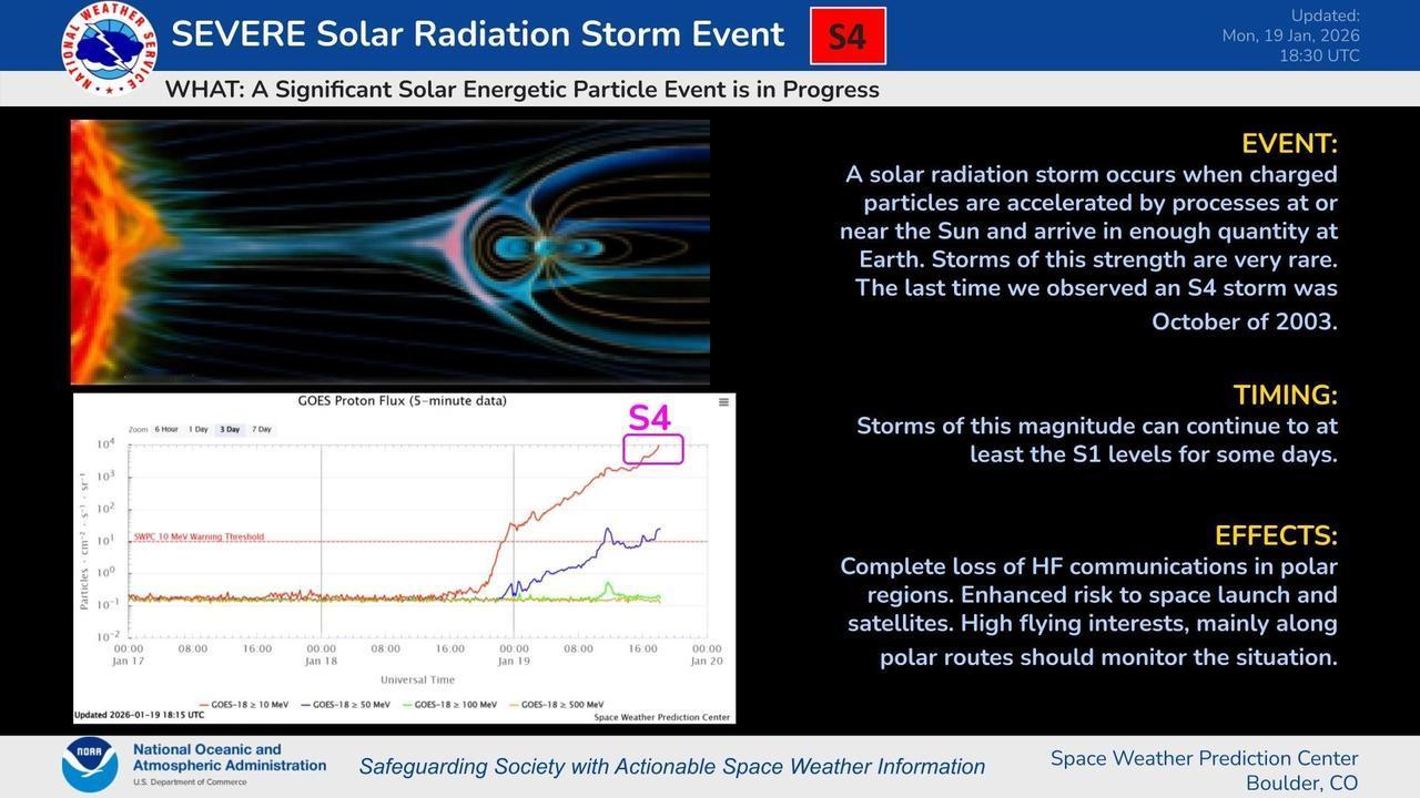 一场S4级强烈的太阳辐射风暴正在进行中——这是20多年来最大的太阳辐射风暴。上一次观察到S4水平是在2003年10月。辐射现象 太阳爆发现象 太阳核爆风