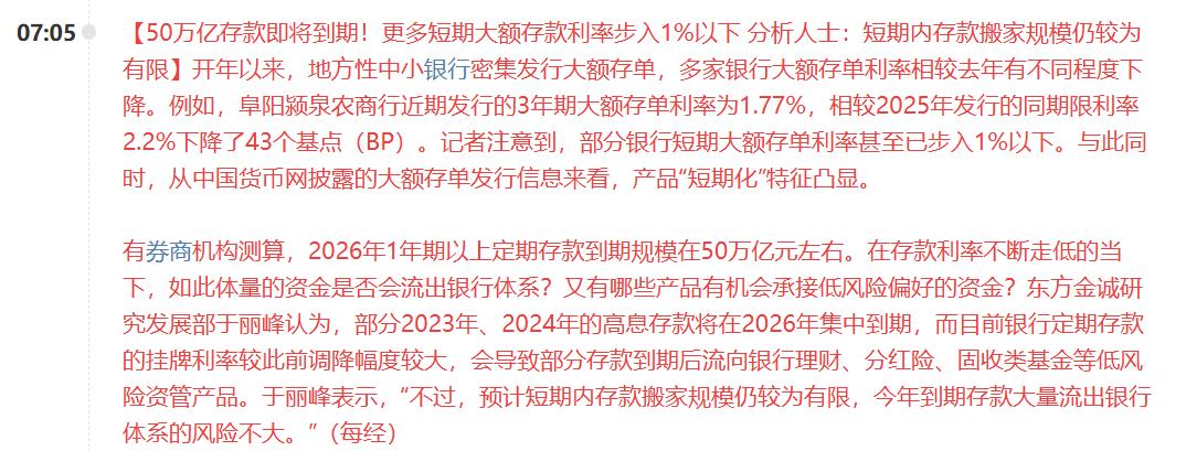 重大利好!50万亿存款即将到期,如果流出部分到股市,那么A股不得雄起? 有券商机构测算,2026年1年期以上定期存款到期规模在50万亿元左右。 而当前,随着不断的降息,利率不断走低,在低利率的背景下,会不会有部分资金开始流入股市? 我想答案是非常有可能的。 进入1月份以来,A股的流动性明显大幅改善,一度多个交易日突破3万亿。 这说明了什么? 这无疑说明不少资金已经被A股的大涨所吸引开始涌入市场。 只要A股慢牛的节奏不变,那么必然会吸引更多的资金开始涌入。毕竟现在存款利率这么低,拿部分进入股市,享受股市的增值,不香吗? 50万亿的存款规模,如果有10%,也就是十分之一能够流入A股,那么就能给市场带来5万亿的增量。 那这么搞,何愁A股2026年不繁荣?